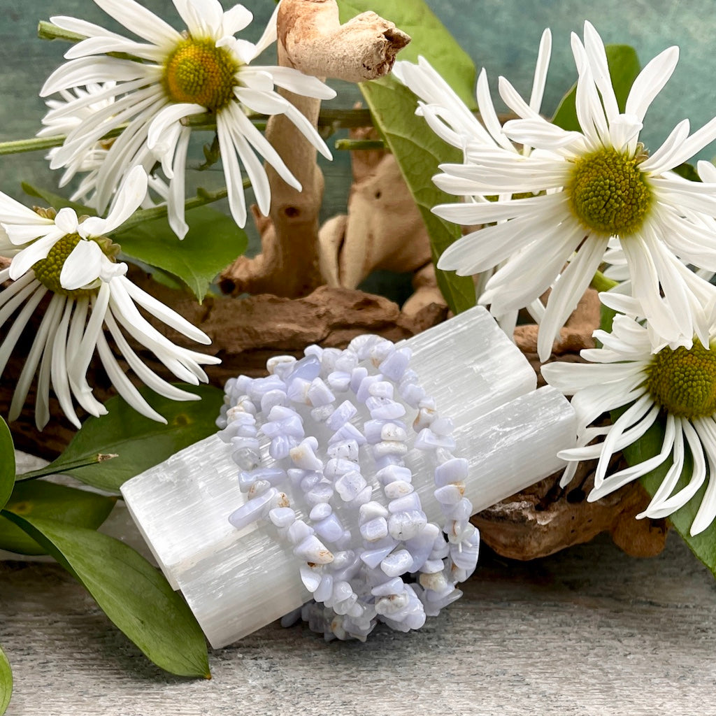 Embrace the calm soothing energy of a Blue Lace Agate Bracelet. This chip bead bracelet is a cute, affordable way to add a little positivity to your day.