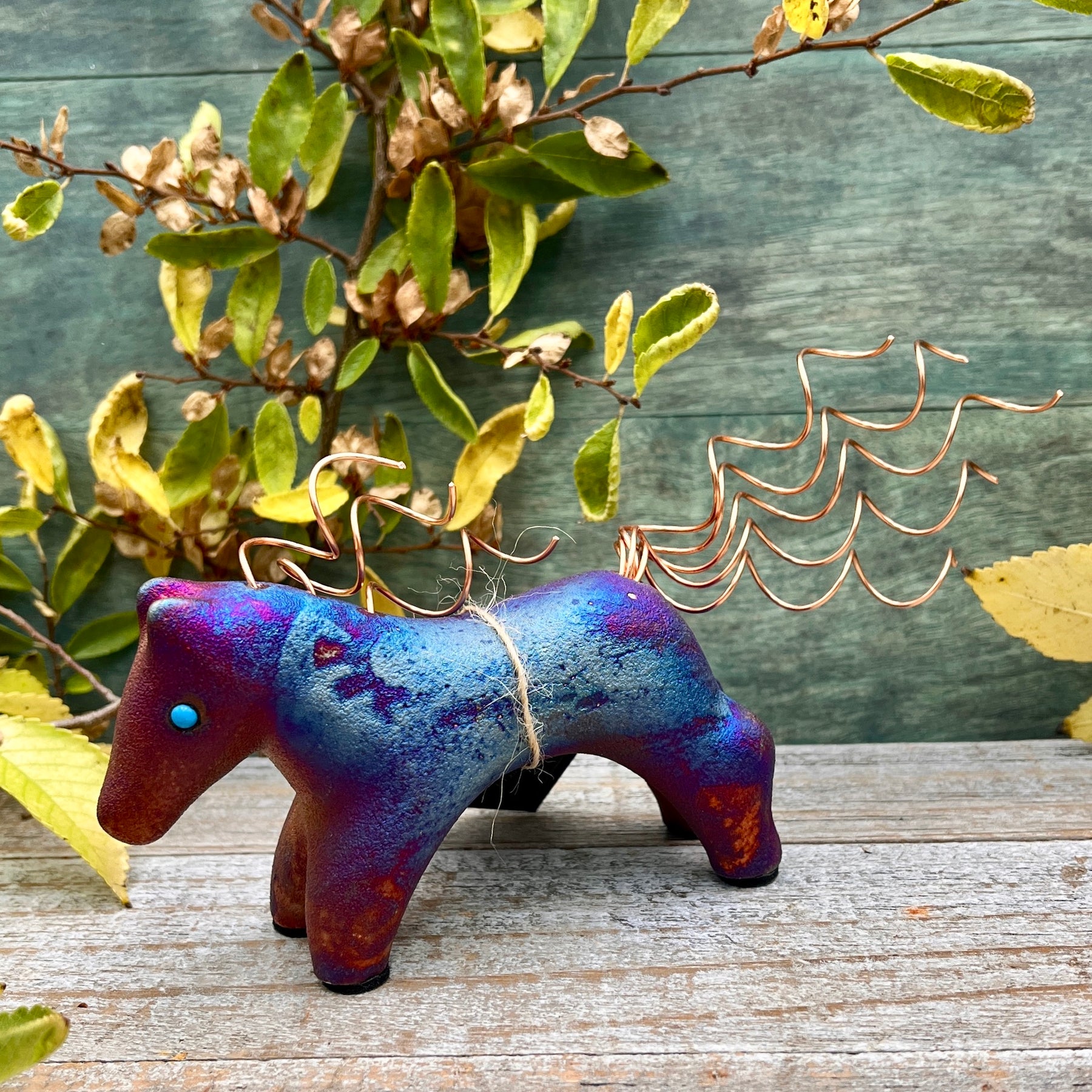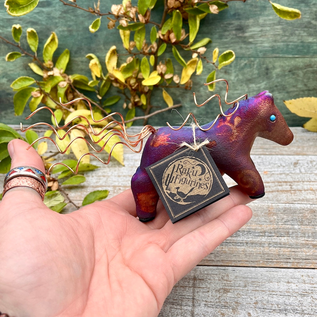 Welcome a symbol of freedom into your home with this Raku Pottery Horse Figurine. With a wild array of metallic colors, and curly copper wire mane and tail, this pony is ready to gallop off into the sunset.