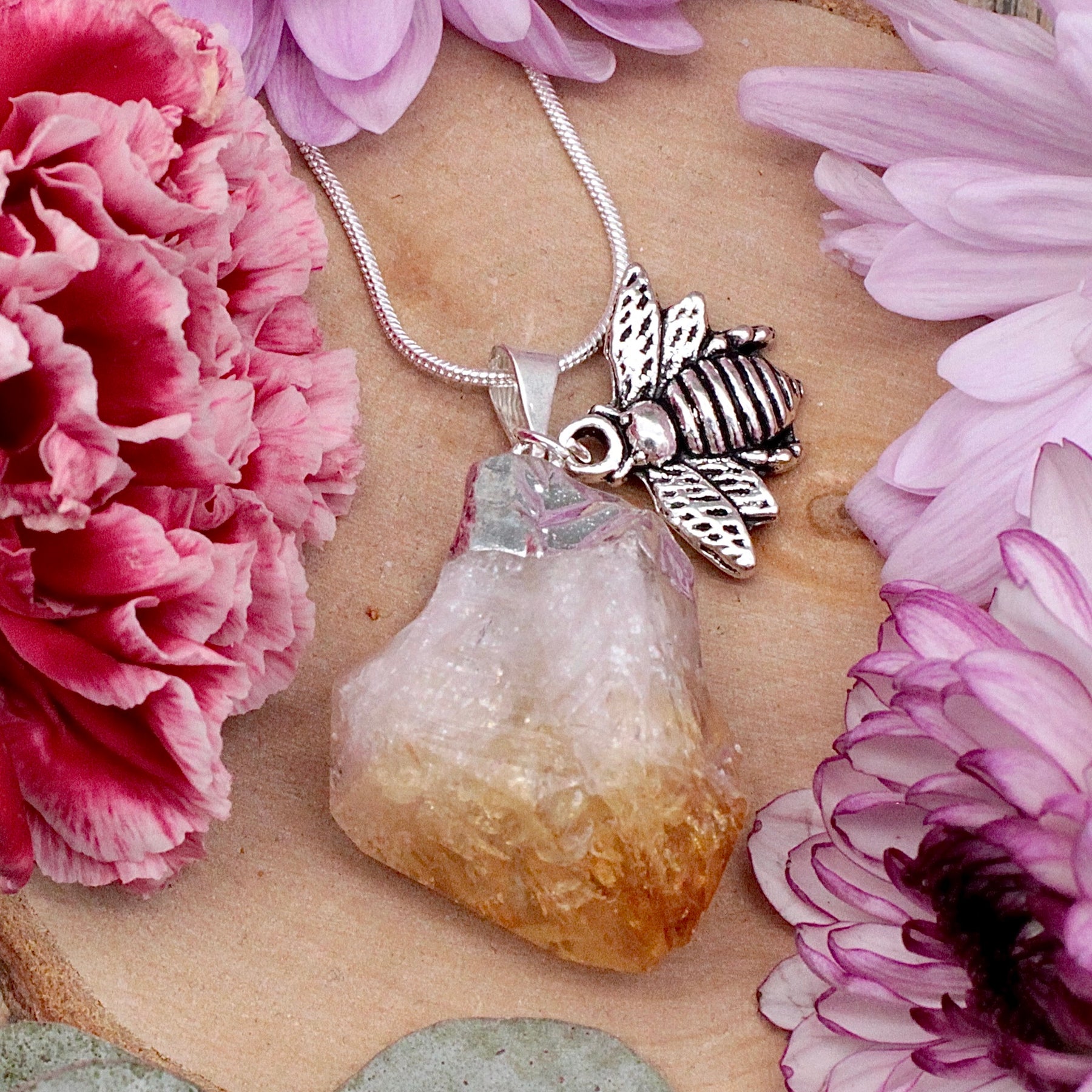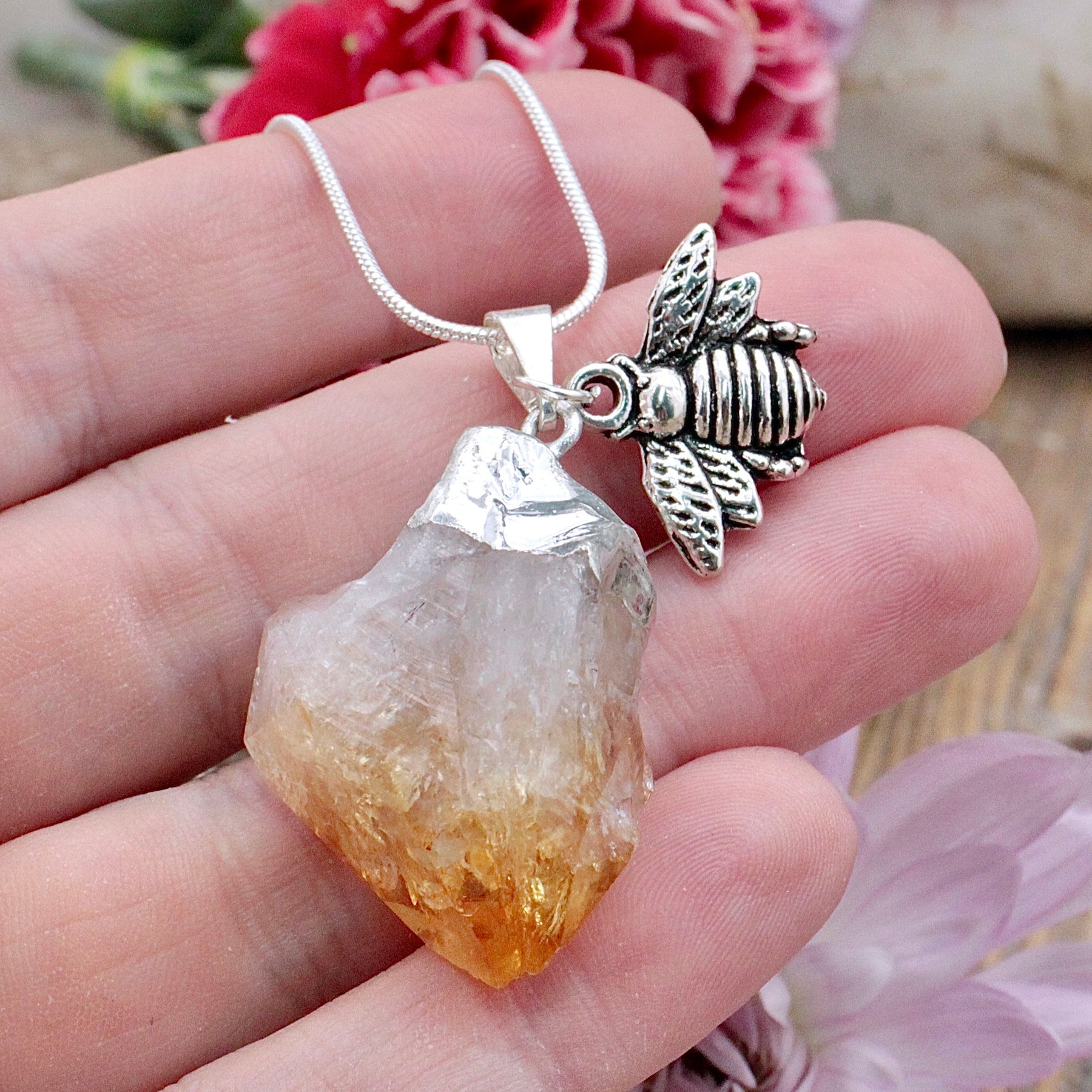 Radiate confidence and abundance with this Citrine Rough Point Pendant with Bee Charm. Known as the stone of prosperity and joy, Citrine’s golden hue invites positivity and success. This sophisticated pendant embodies warmth and energy, making it the perfect accessory to uplift and inspire your spirit.