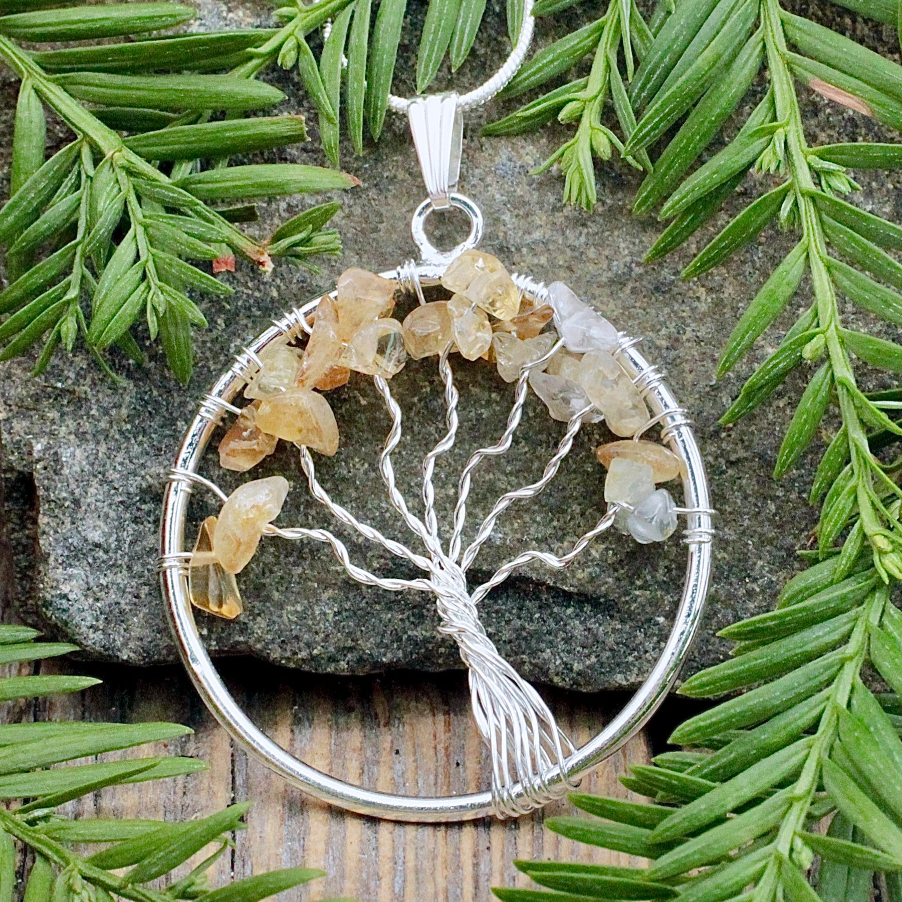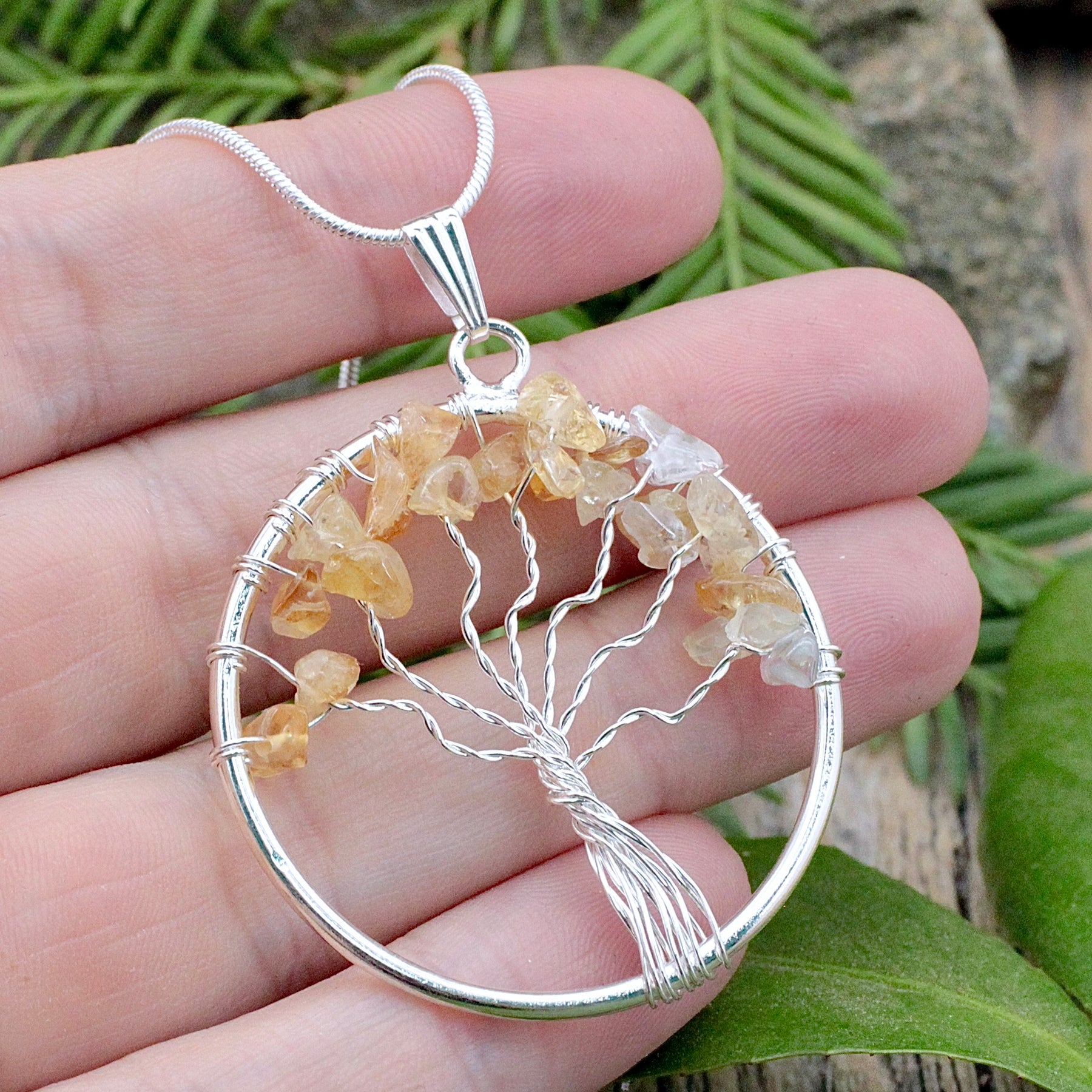 Embrace abundance with this Citrine Tree of Life Pendant. Crafted with care, this stunning piece features vibrant Citrine stones that symbolize prosperity and joy. The intricately wrapped tree design signifies growth and strength, making it a perfect accessory for attracting positive energy and success.