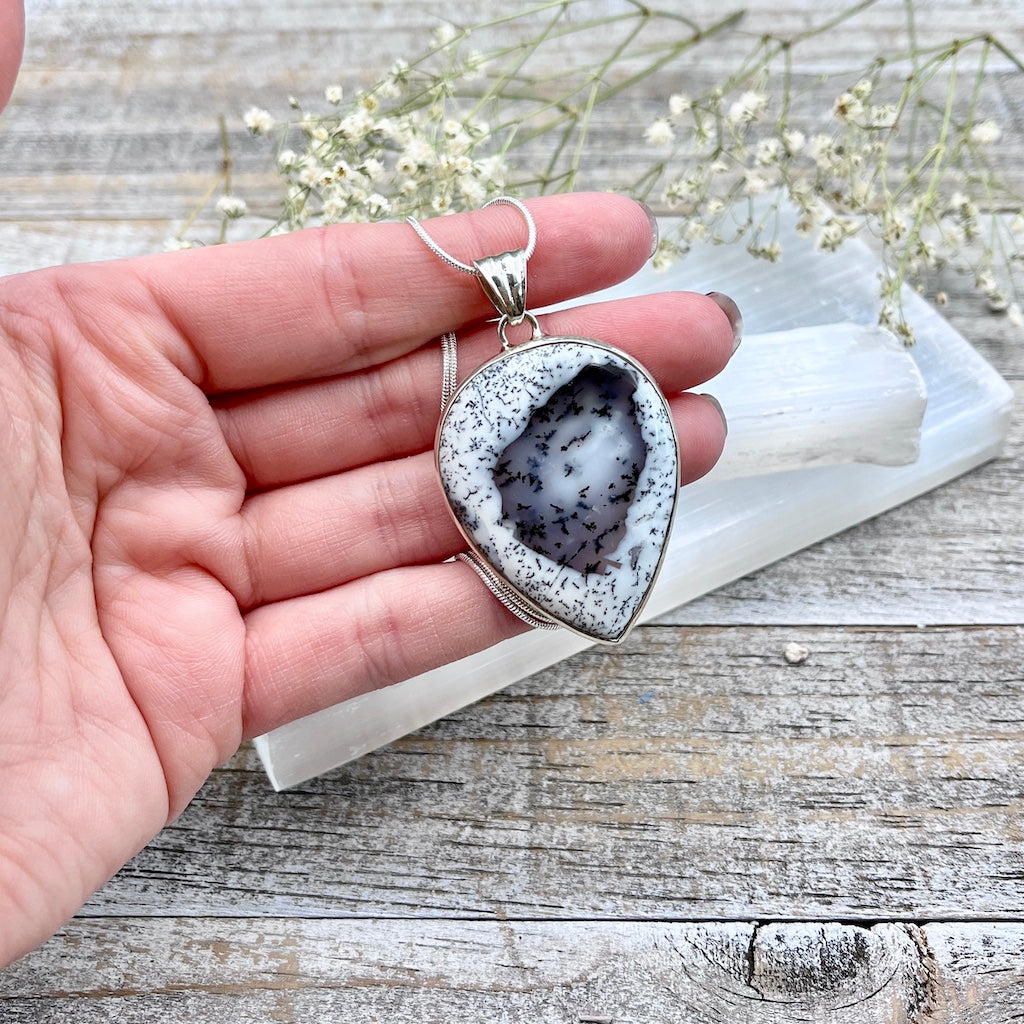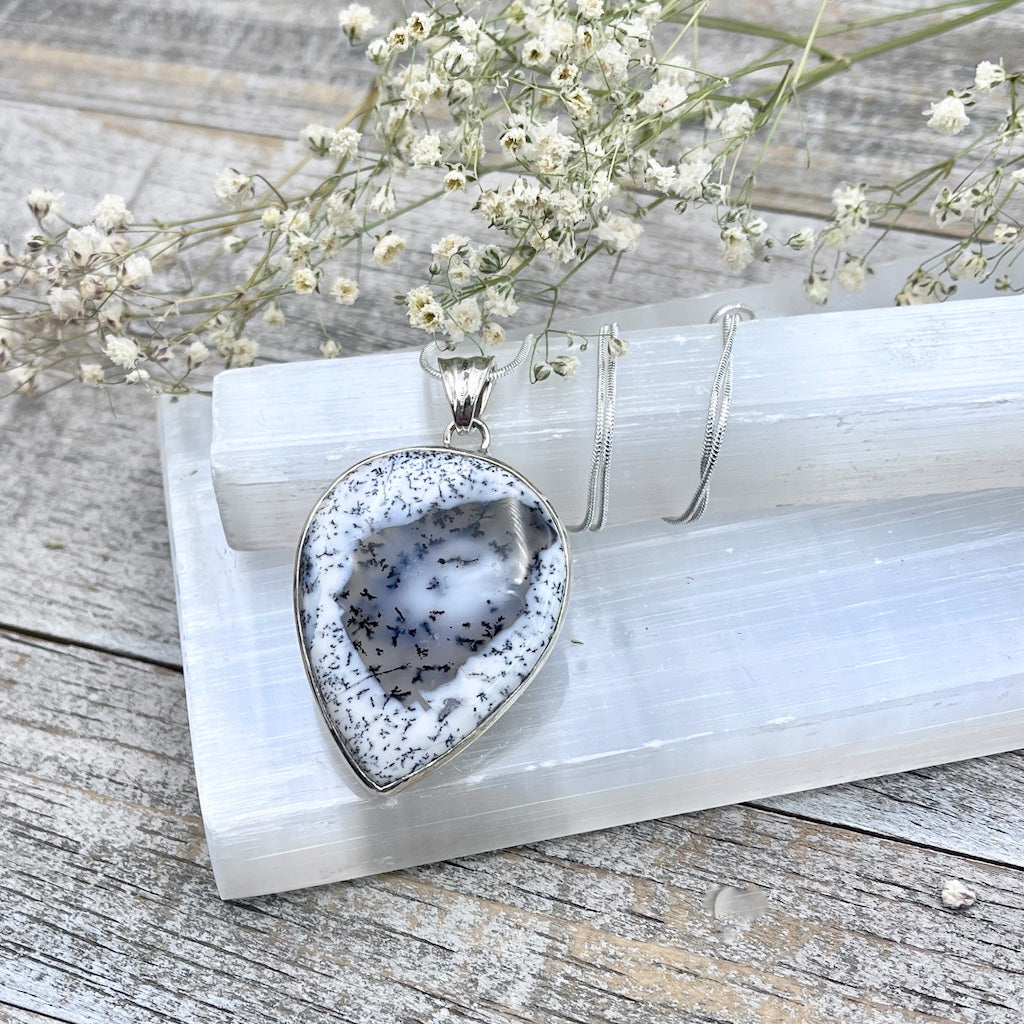 Promote peace and stability with this Dendritic Agate Pendant. This pendant has a simple sterling silver setting that does not distract from the complex beauty of this stone - with its swirls and speckles of gray and black against a background of white, Dendritic Agate is nature's artwork.