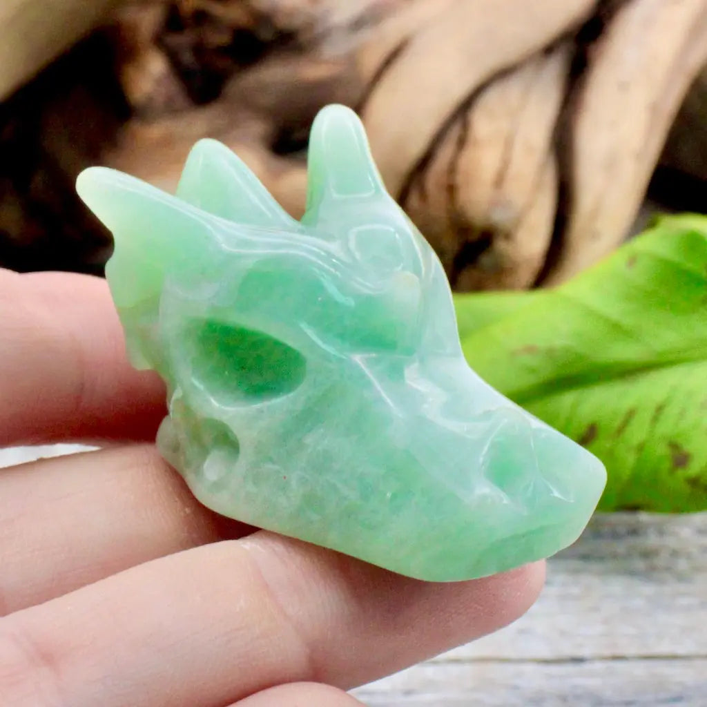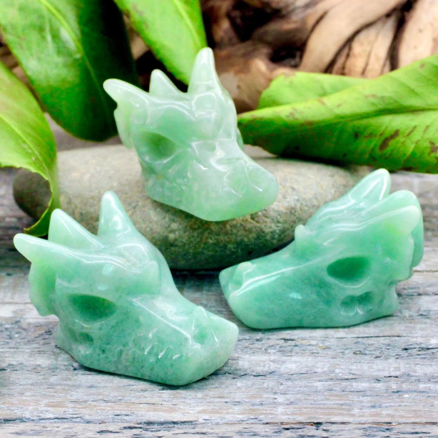Invite health and good fortune into your life with this Green Aventurine dragon skull carving.