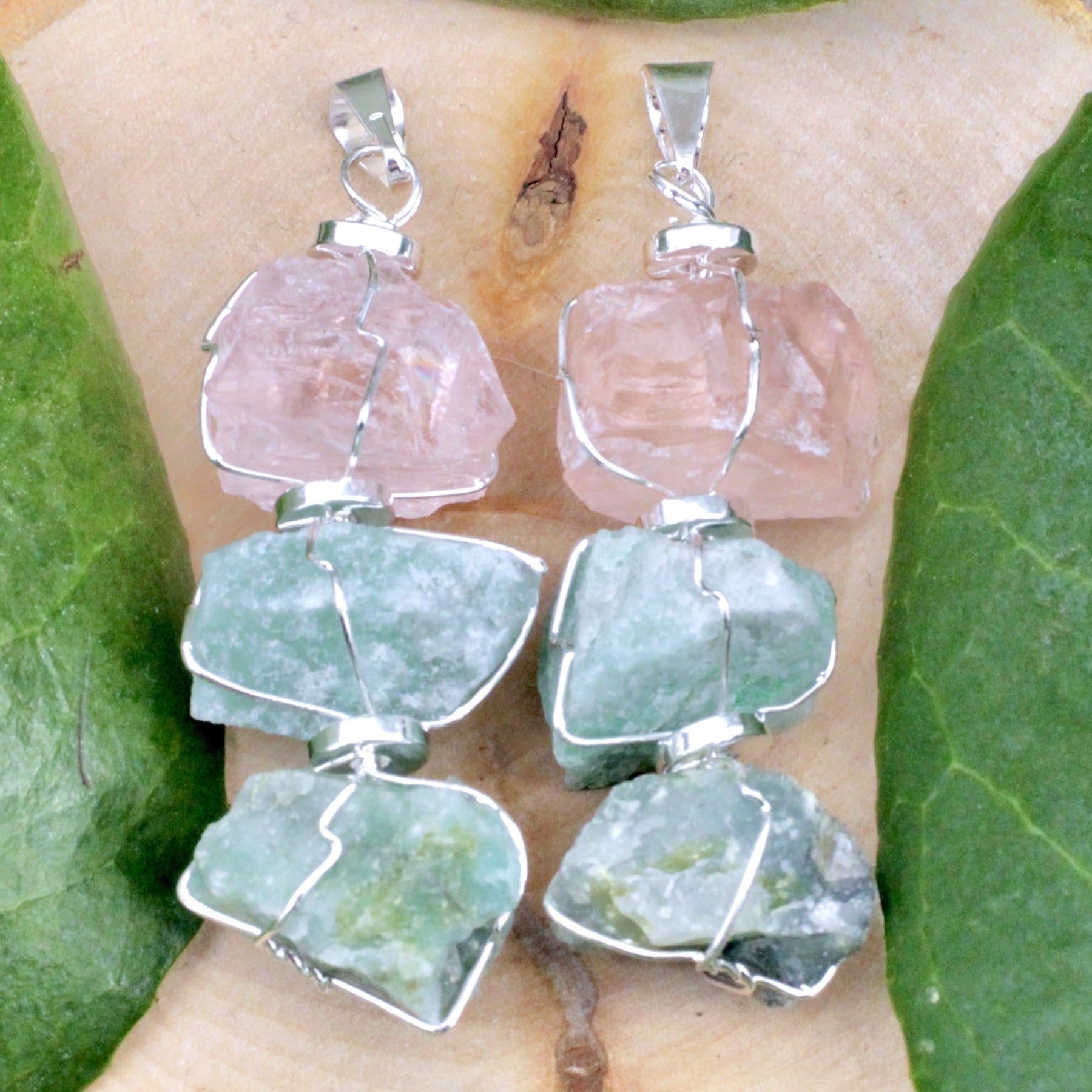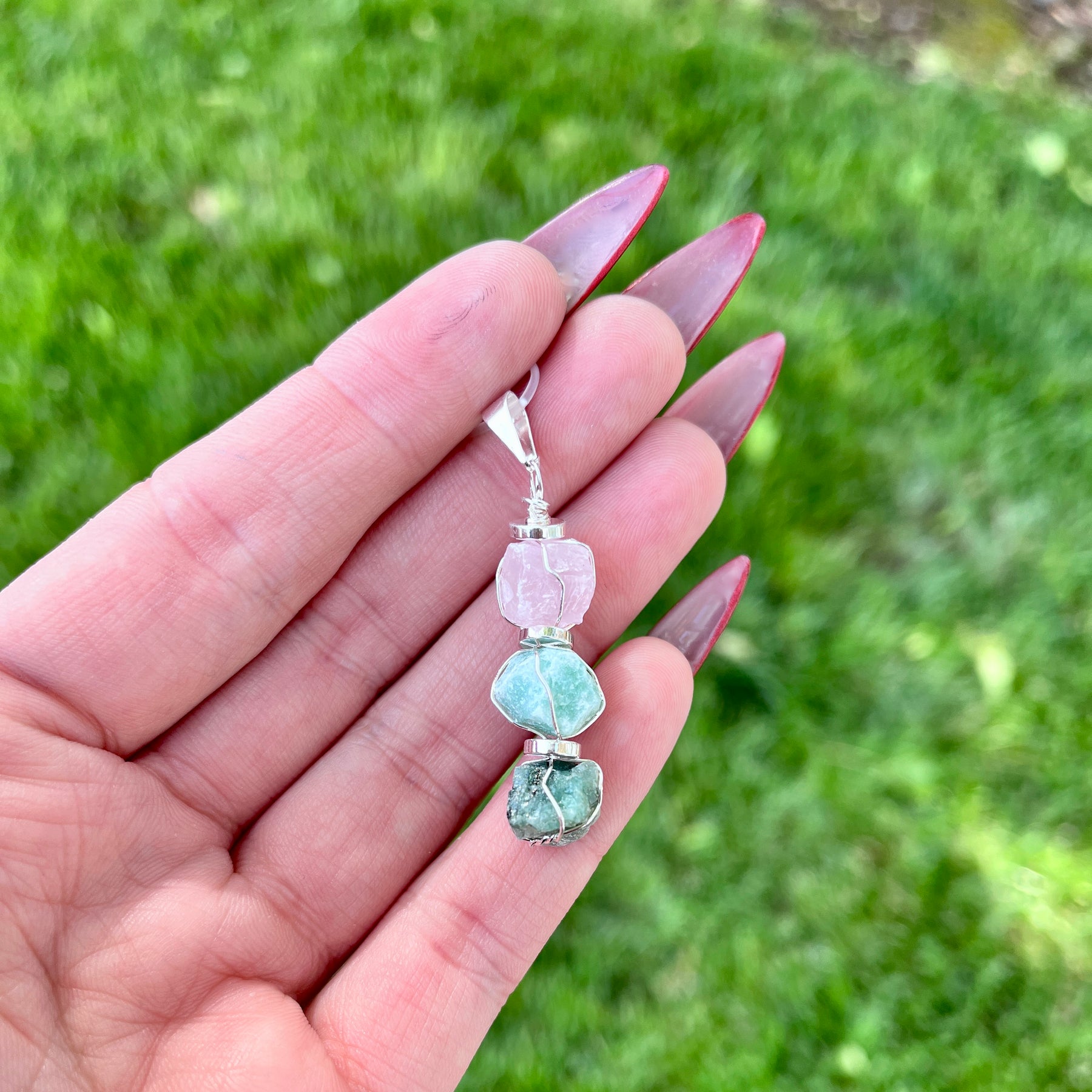 Elevate your heart's energy with this Heart Chakra Three Stone Pendant. Infused with Rose Quartz, Green Aventurine, and Emerald, it fosters love, harmony, and growth. Embrace compassion and balance with this powerful trio of stones.