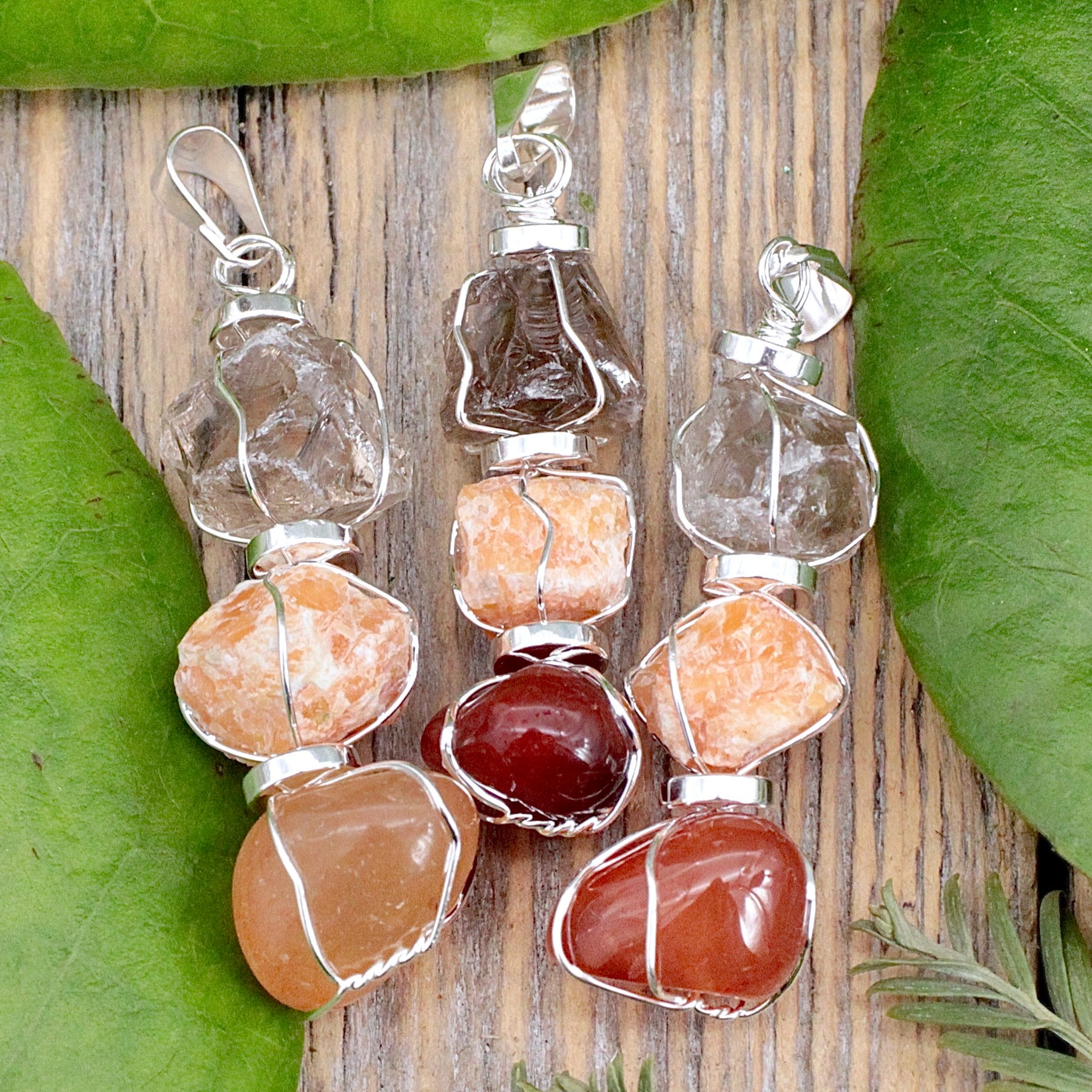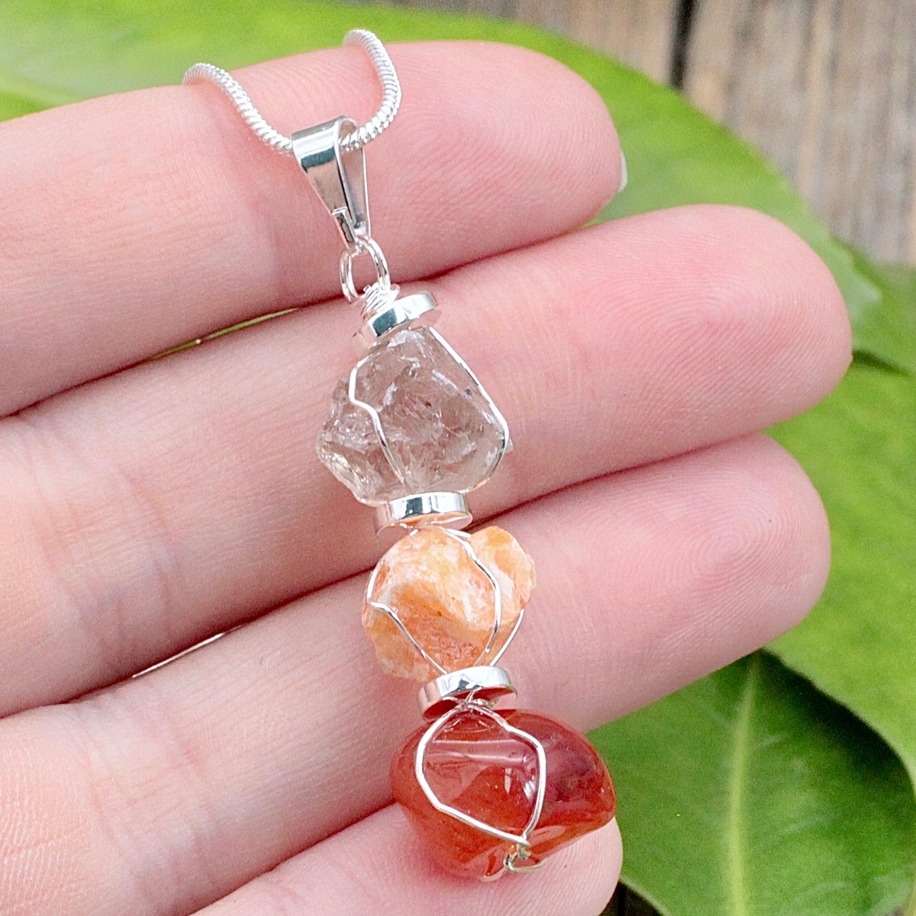 Awaken your creativity with this Sacral Chakra Three Stone Pendant. Crafted with Smoky Quartz, Orange Aventurine, and Carnelian, it ignites passion and vitality. Embrace your inner fire and express your authentic self with this vibrant trio of stones.
