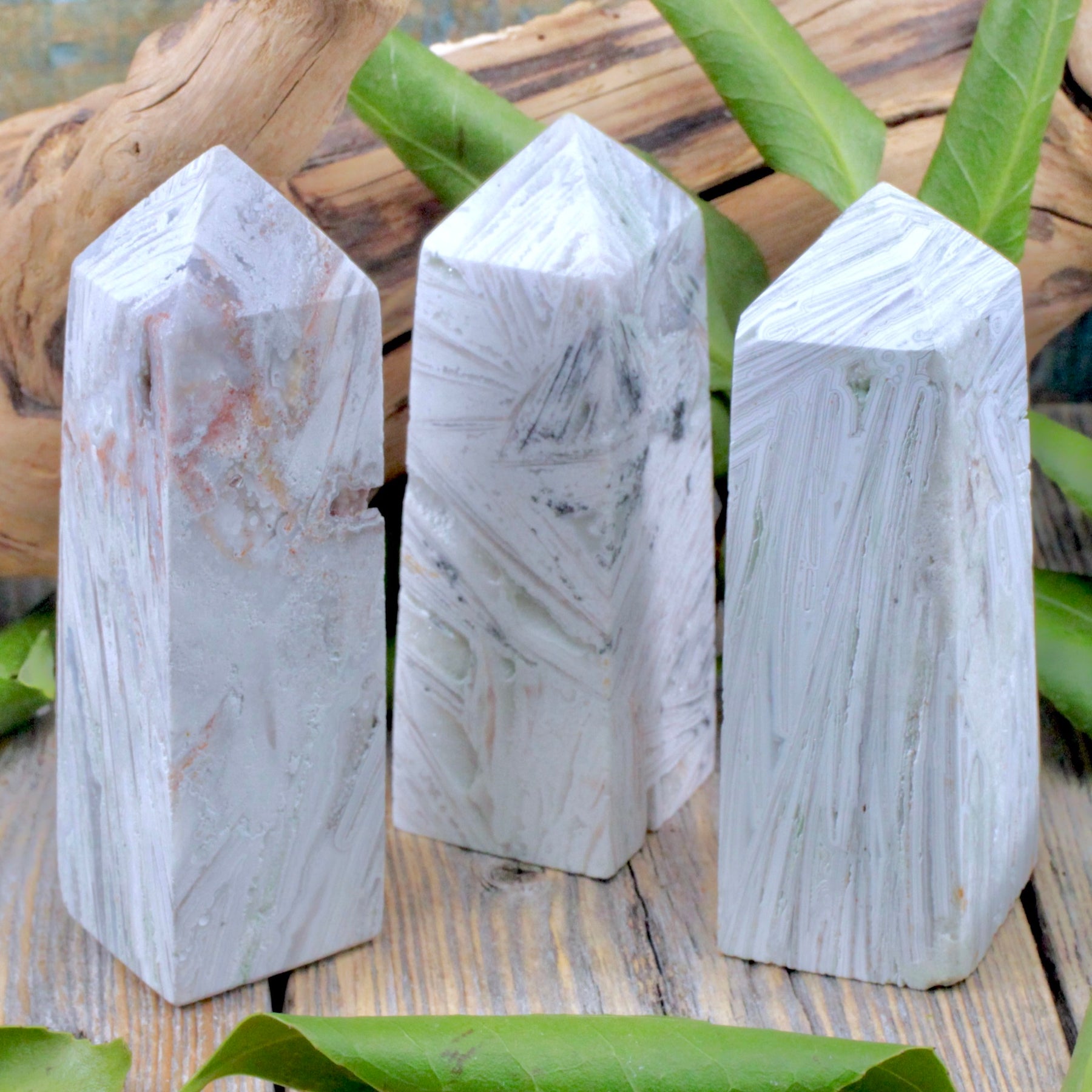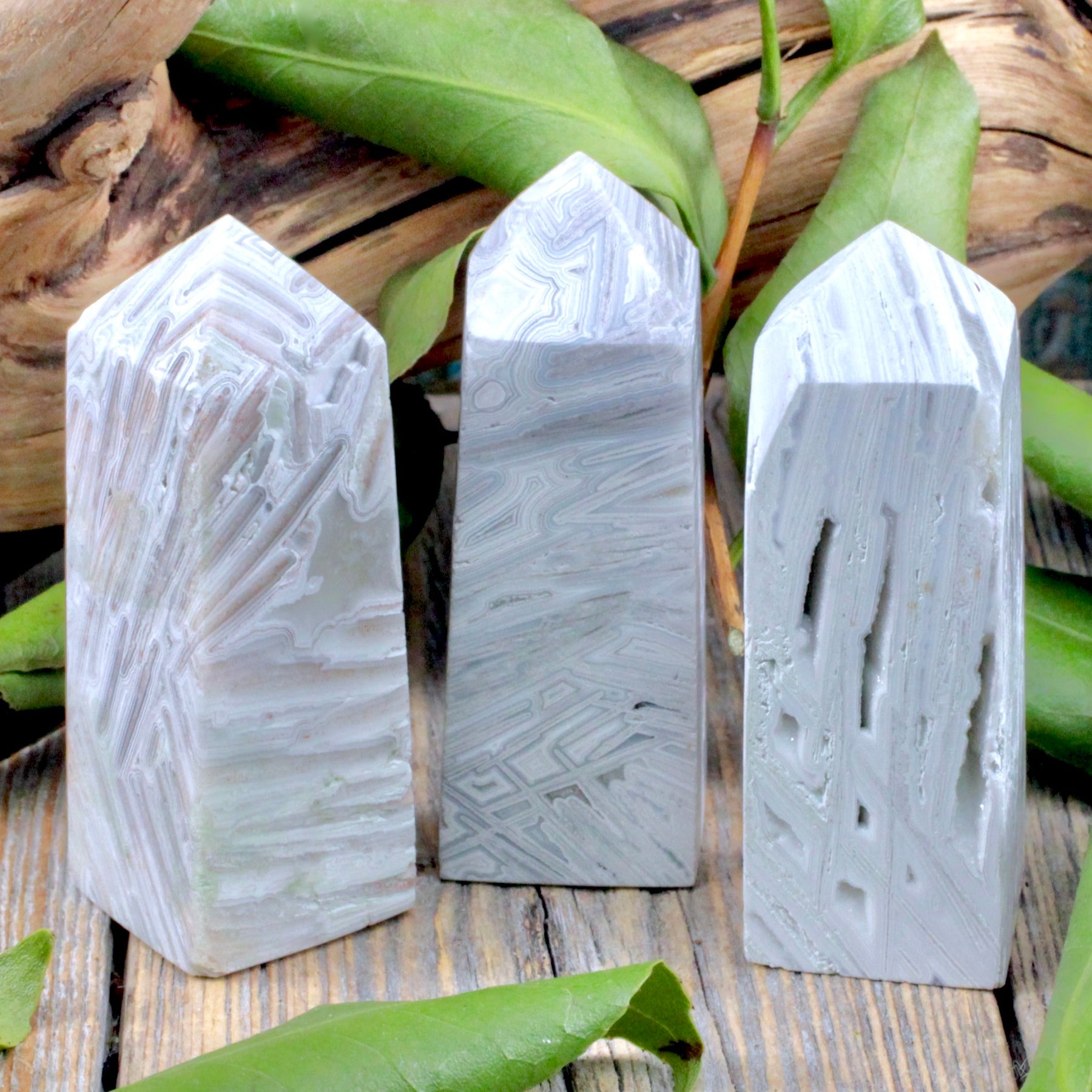 Develop a balanced sense of self with this Snow Agate Tower. Also known as White agate, this Snow Agate tower is a wonder to behold. The stripes of white on grey create complex patterns. Not unlike the complex energies that tie us all together in the universe as this stones energy can remind us.