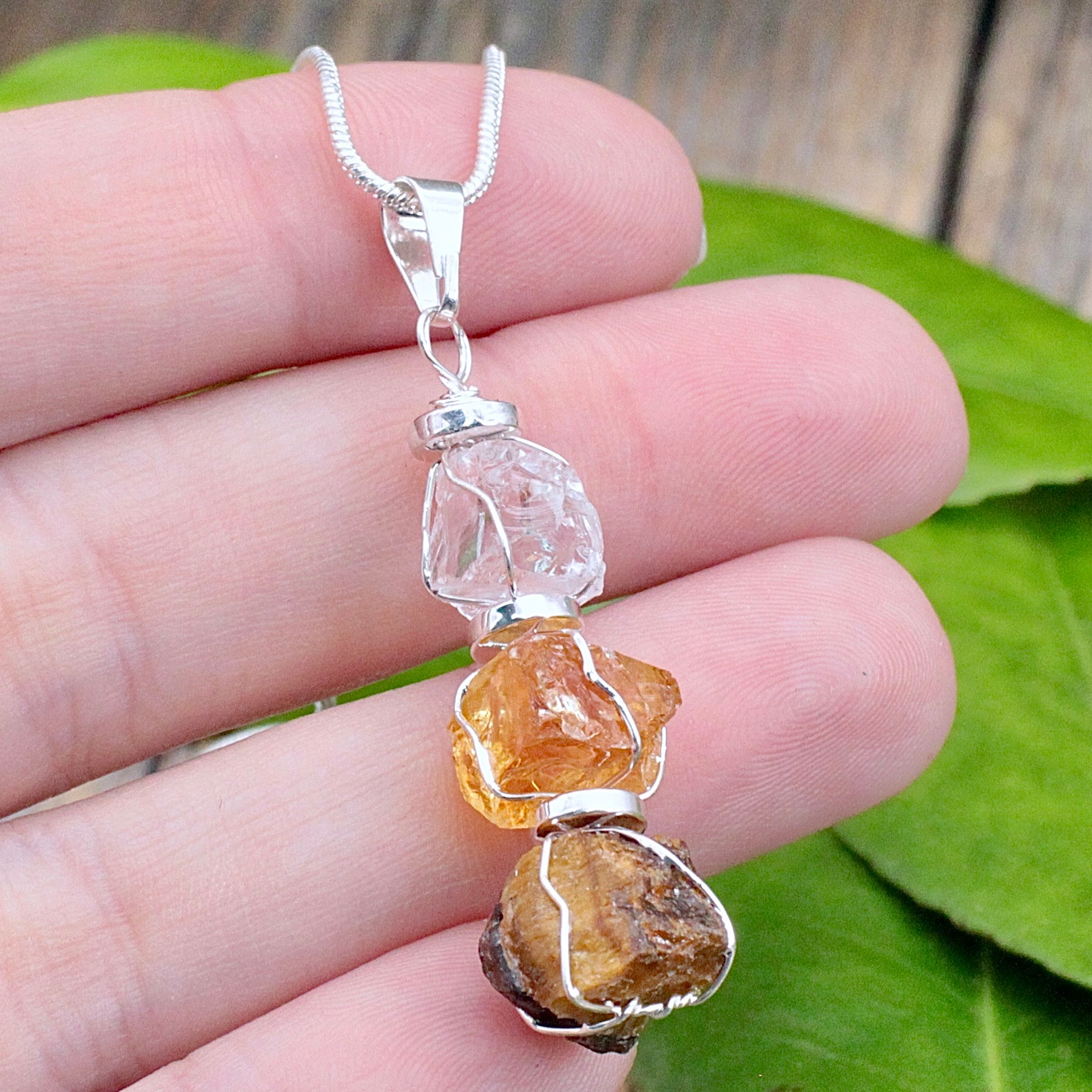 Illuminate your confidence with this Solar Plexus Chakra Three Stone Pendant. Featuring Citrine, Tiger's Eye, and Quartz, it ignites personal power and clarity. Embrace courage and vitality with this dynamic trio of stones.