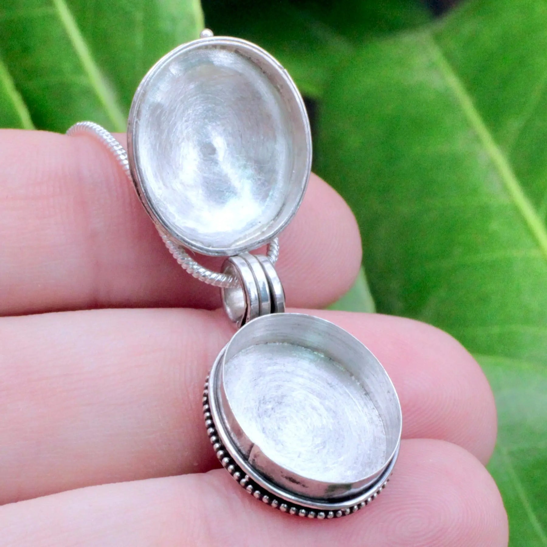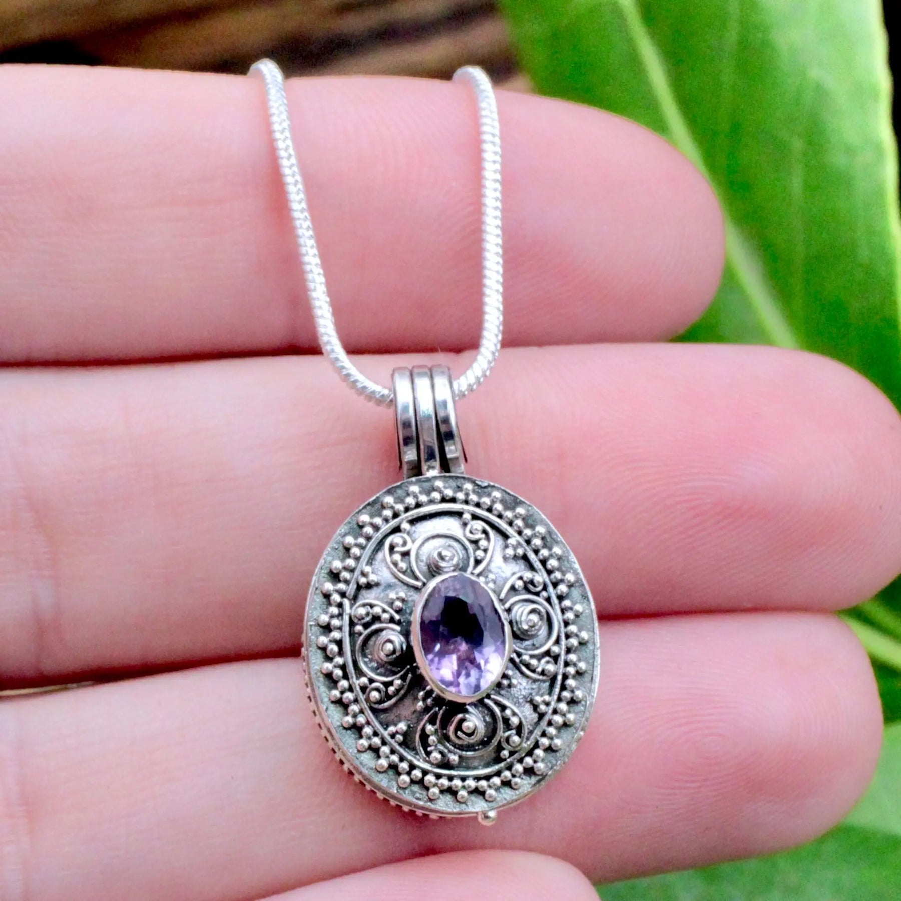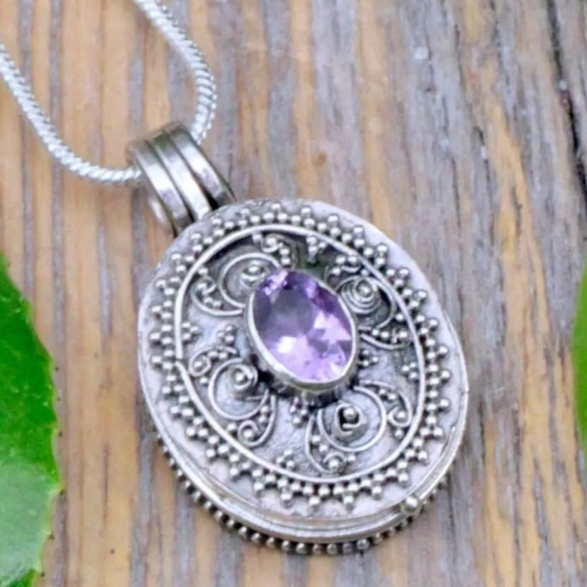 Bring serenity into your world with this Amethyst Locket Pendant. Done in sterling silver this intricately designed pendant opens to hold tiny treasures like a photo of a loved one, a lock of hair, or some other small wonder.