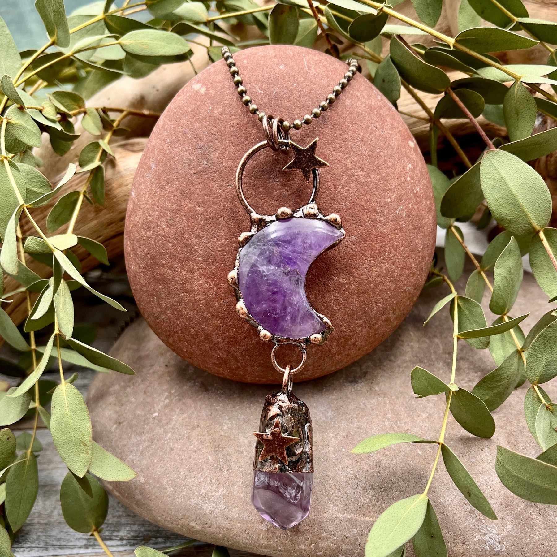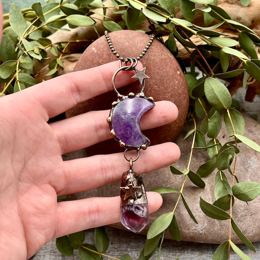 Increase serenity with this Amethyst Moon Necklace. Done in a warm bronze finish and accented with an Amethyst drop, this stellar statement necklace is a great gift for the star gazer in your life!