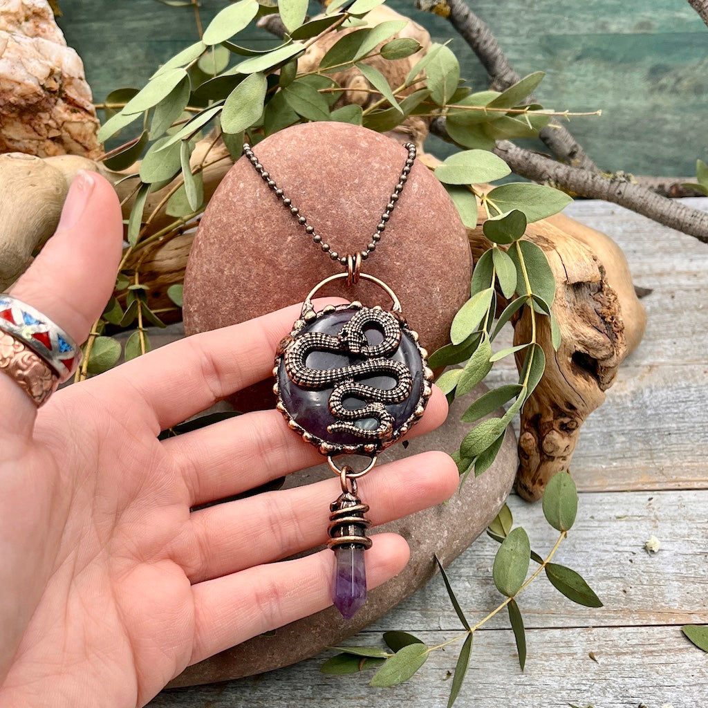 Protect against negativity with this Amethyst Snake Necklace. Done in a bold bronze finish, this striking serpent pendant adds flair while the Amethyst brings in loving, positive energies.