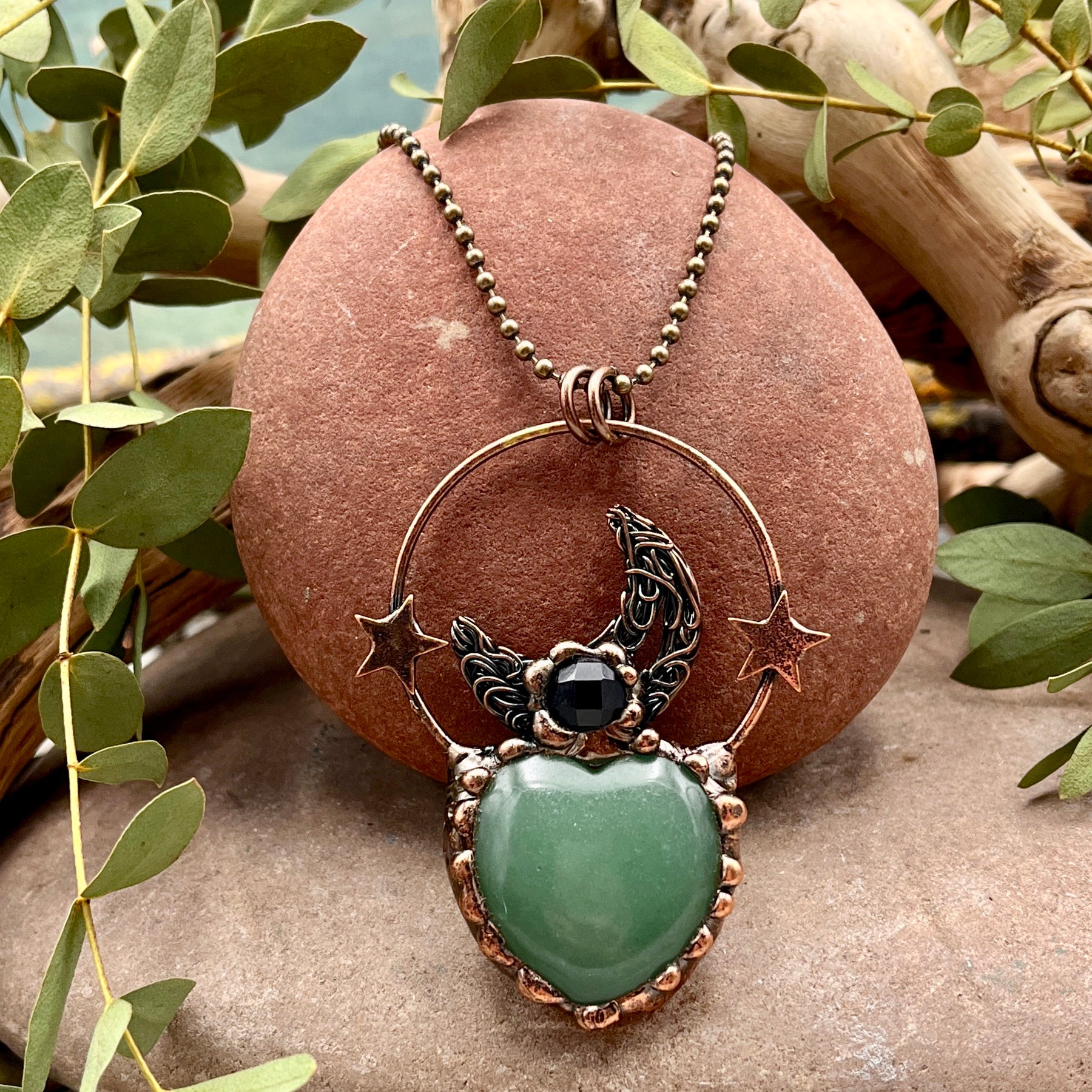 Connect to your heart Chakra with this Green Aventurine Heart Moon & Stars Necklace. Done in beautiful bronze, this celestial treasure brings in abundance and helps to turn negative situations into positives.