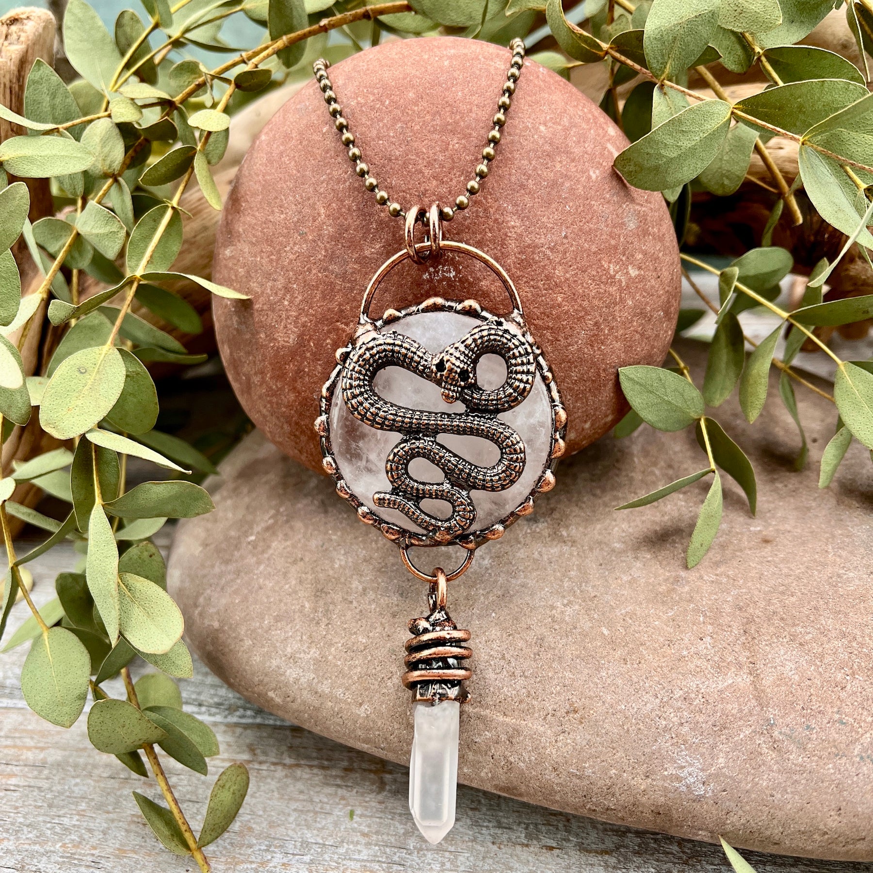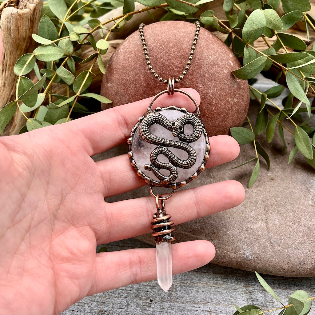 Welcome in positive energies with this Quartz Snake Necklace. Historically snakes have been symbols of creativity, rebirth, transformation, immortality, and healing. This bronze beauty helps to remind us to stay flexible, and go with the flow.