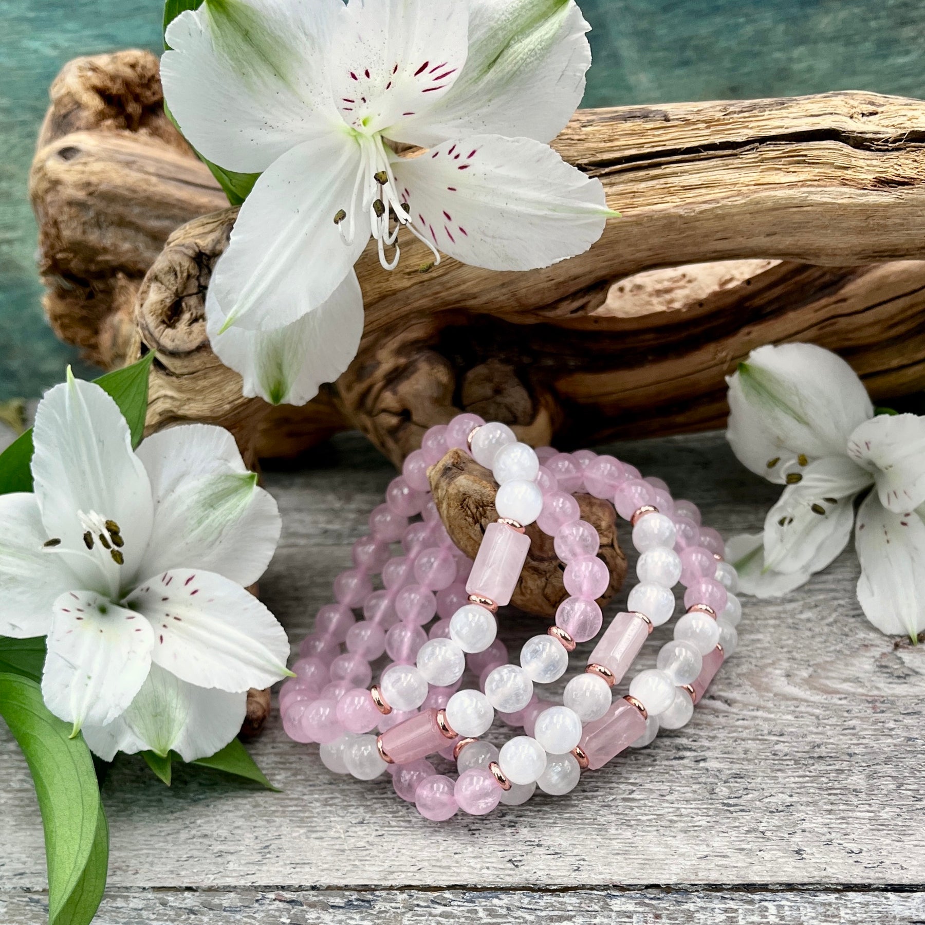 Invite Peace and harmony into your day with this Rose Quartz & Selenite Bracelet. This fun fanciful bracelet features a lovely combination of stones that work together to bring in energies of love, health, and intuition.