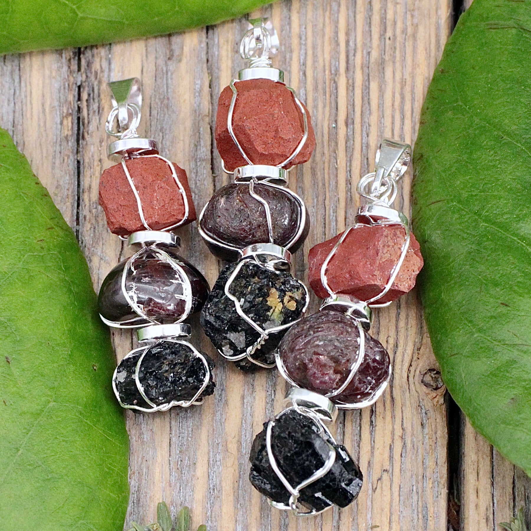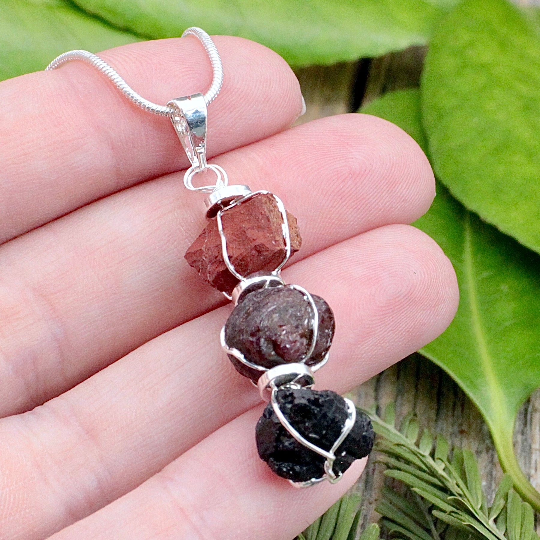 Ground your energy with this Root Chakra Three Stone Pendant. Featuring Garnet, Red Jasper, and Black Tourmaline, it anchors you to stability and protection. Embrace security and strength with this powerful combination of stones.