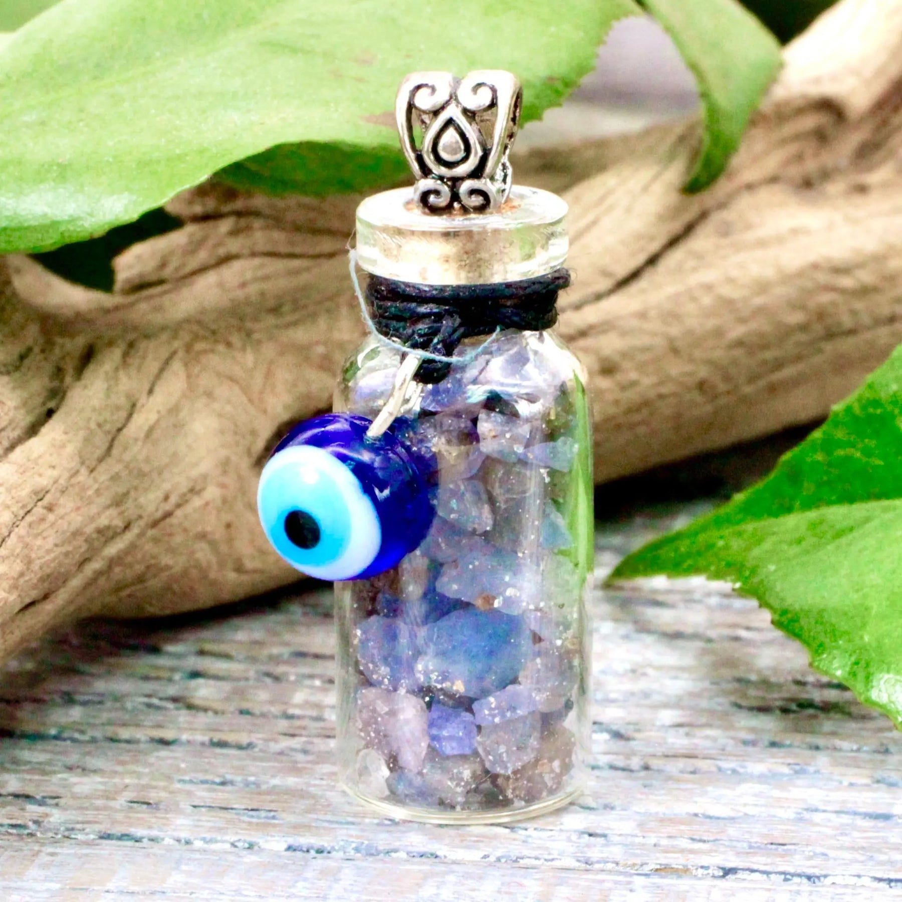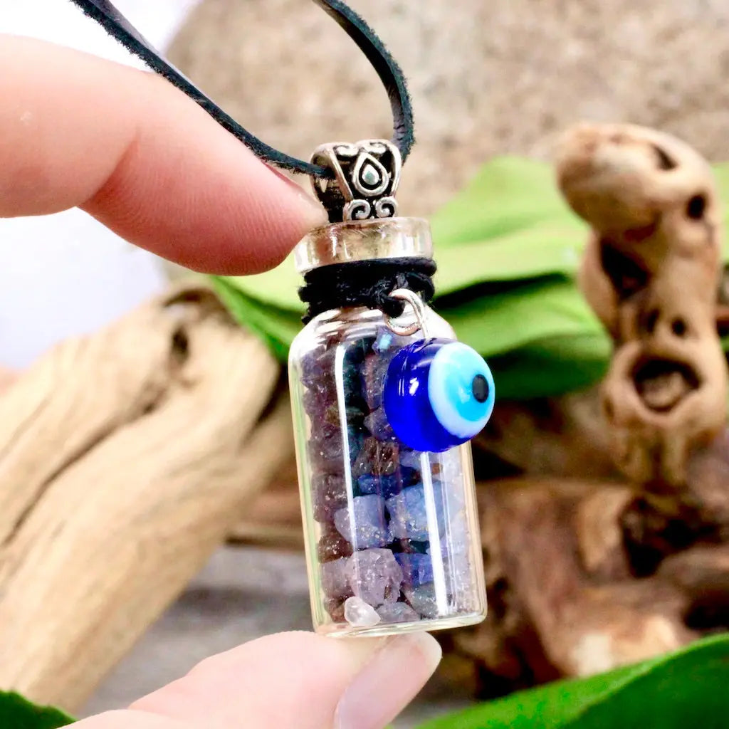 Facilitate a positive life with this Block Negative Energy Spell Jar with Sapphire Necklace. With gorgeous blue colors, Sapphire allows you to connect to a spiritual plane and find love and harmony in your life. The leather cord is fully adjustable and the evil eye charm is a special touch.
