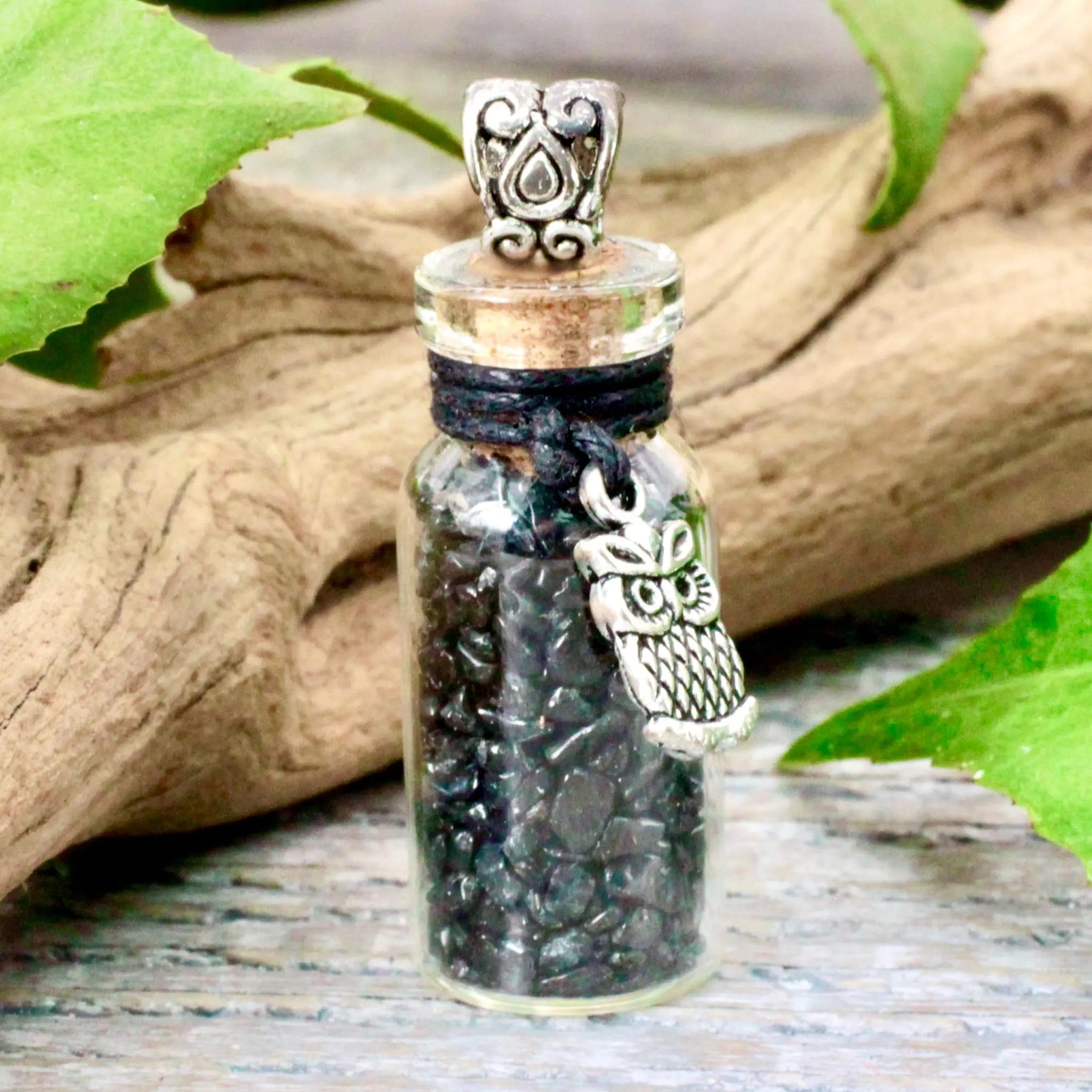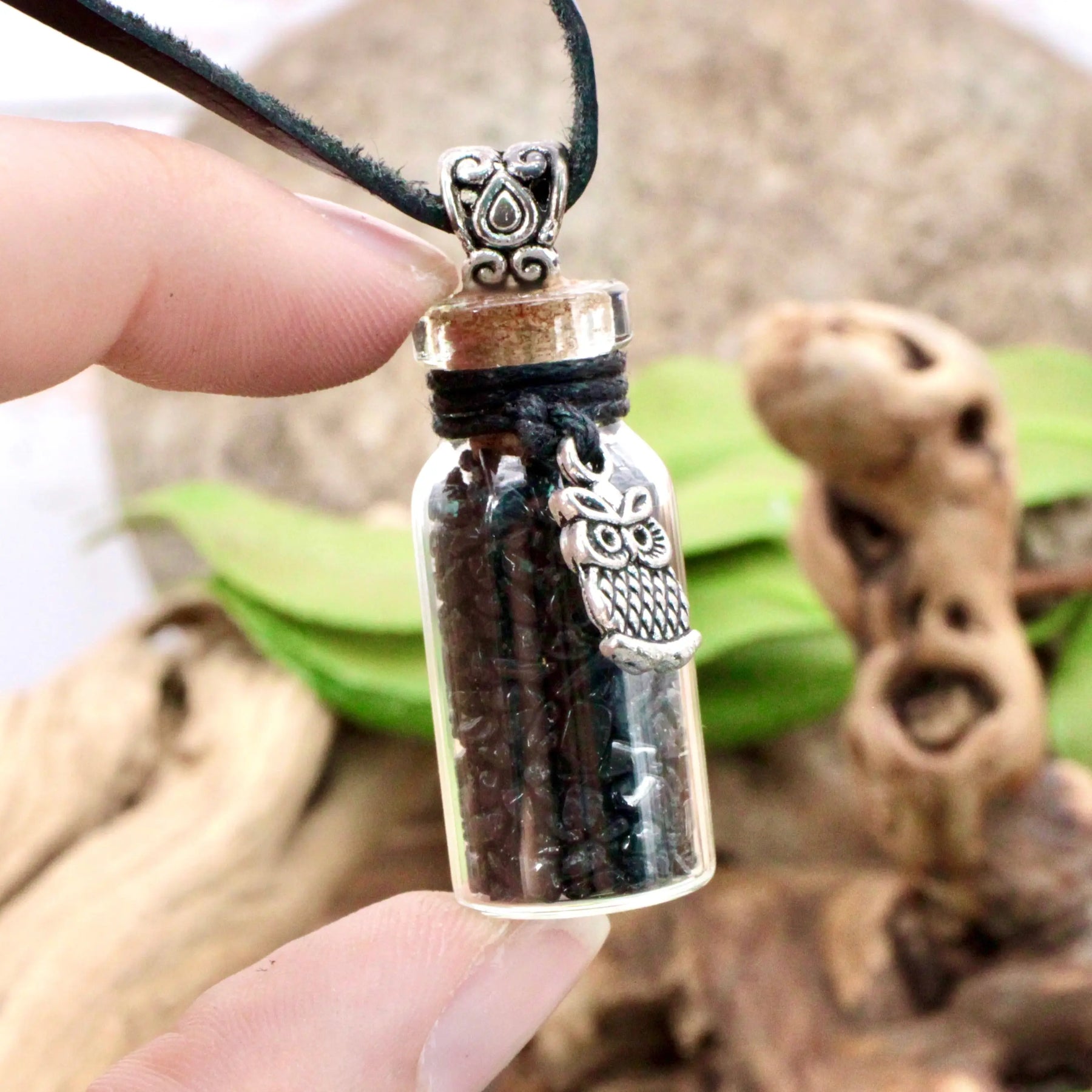 Gain insight with this Vision Spell Jar Necklace with Black Tourmaline. The deep black hue of the stone helps to ground your mind as the stone ushers in protection and a new, more positive way of thinking. The leather cord is fully adjustable and the owl charm is so cute.