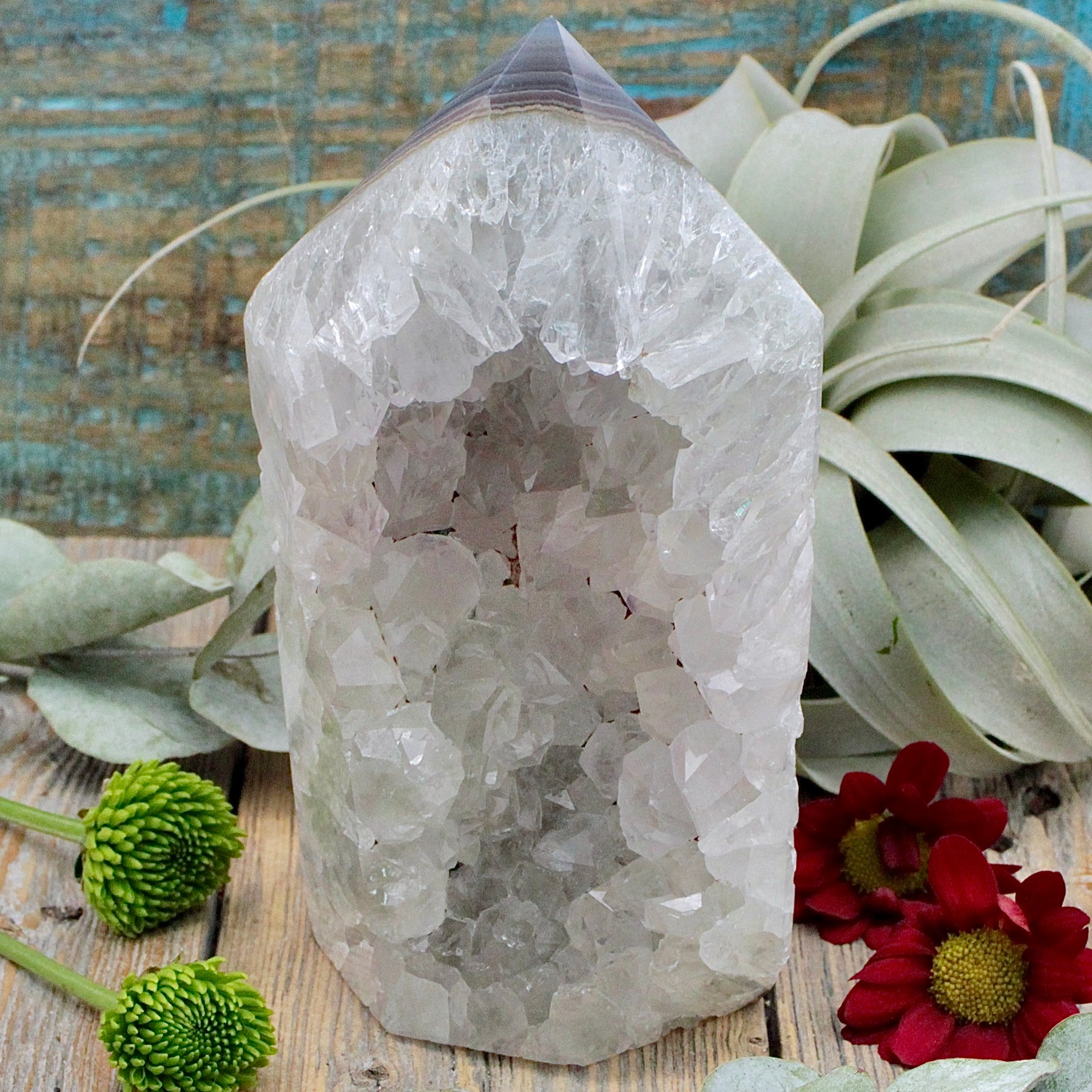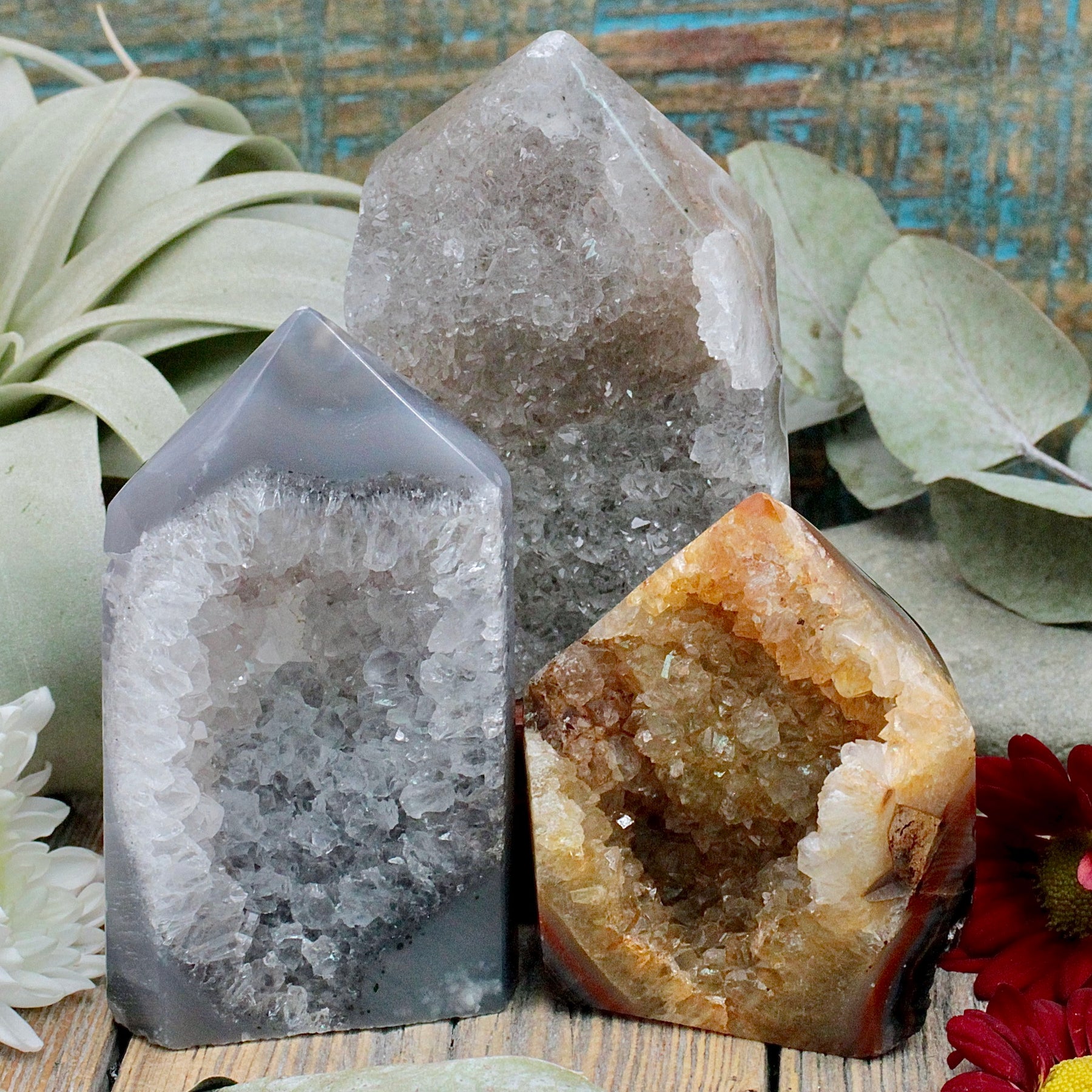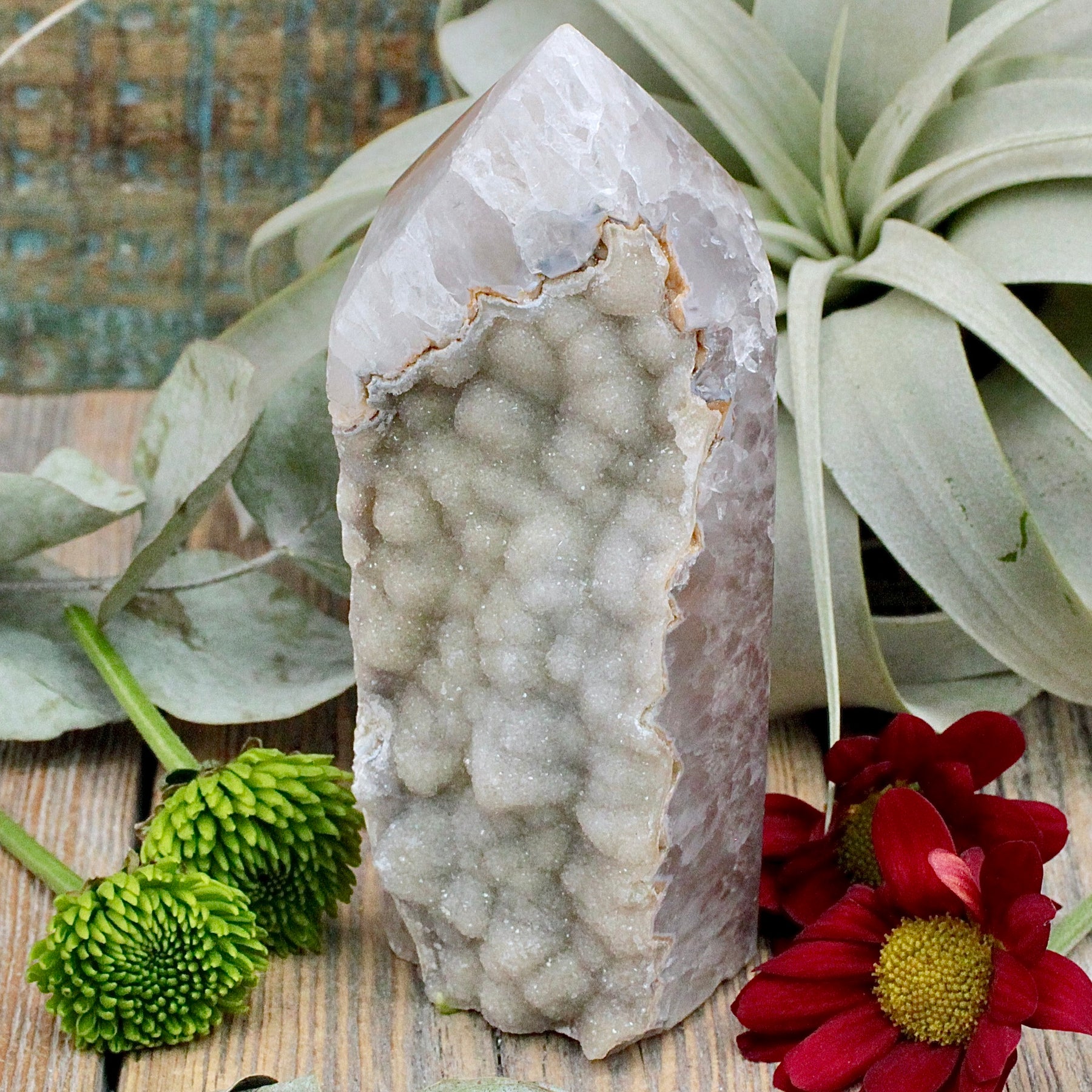 Embark on a serene odyssey to harmony and tranquility through this Agate Druzy Tower. Enchanting and captivating, this crystal fosters grounding, balance, and potent healing energies. Elevate your spiritual voyage today and bask in its mesmerizing aura.