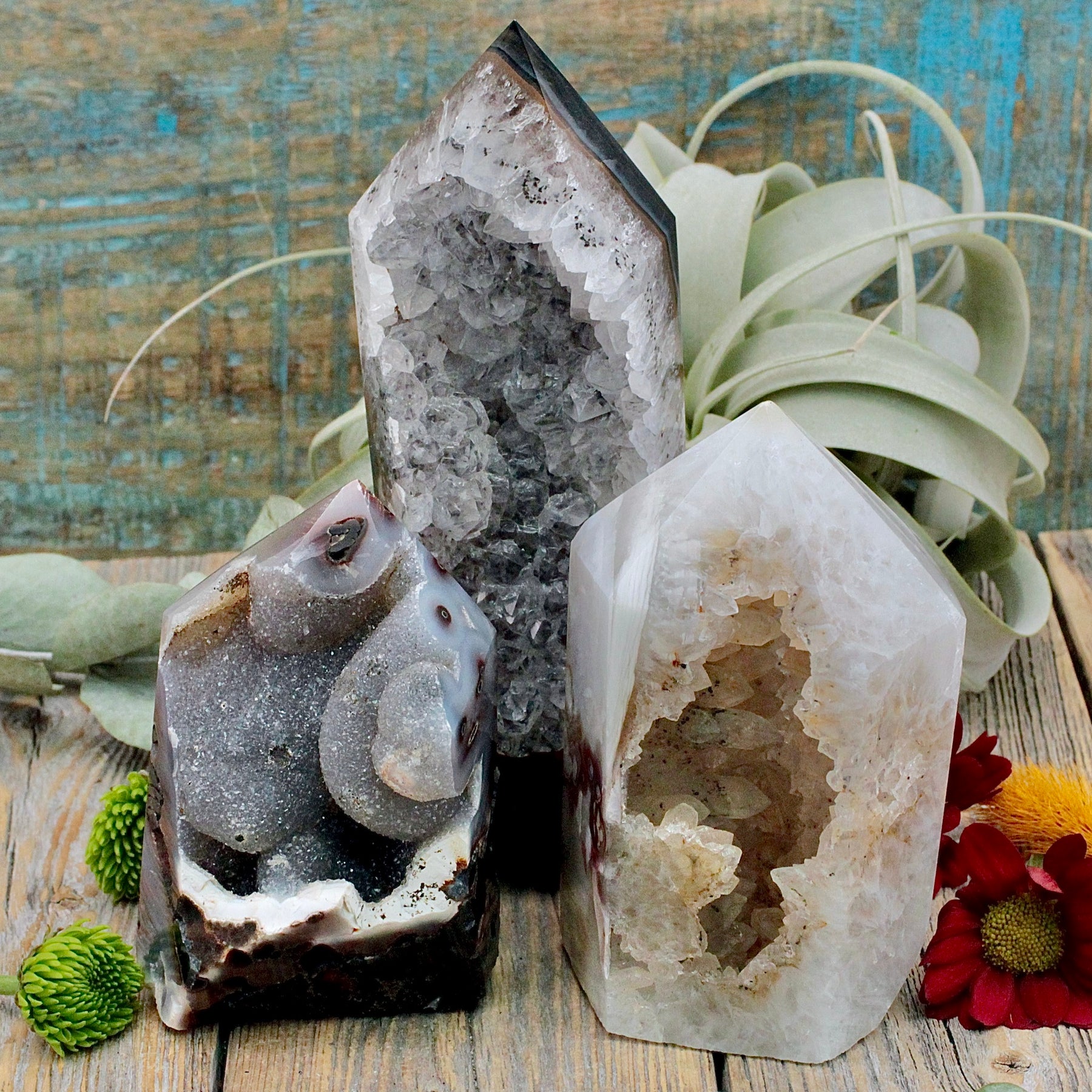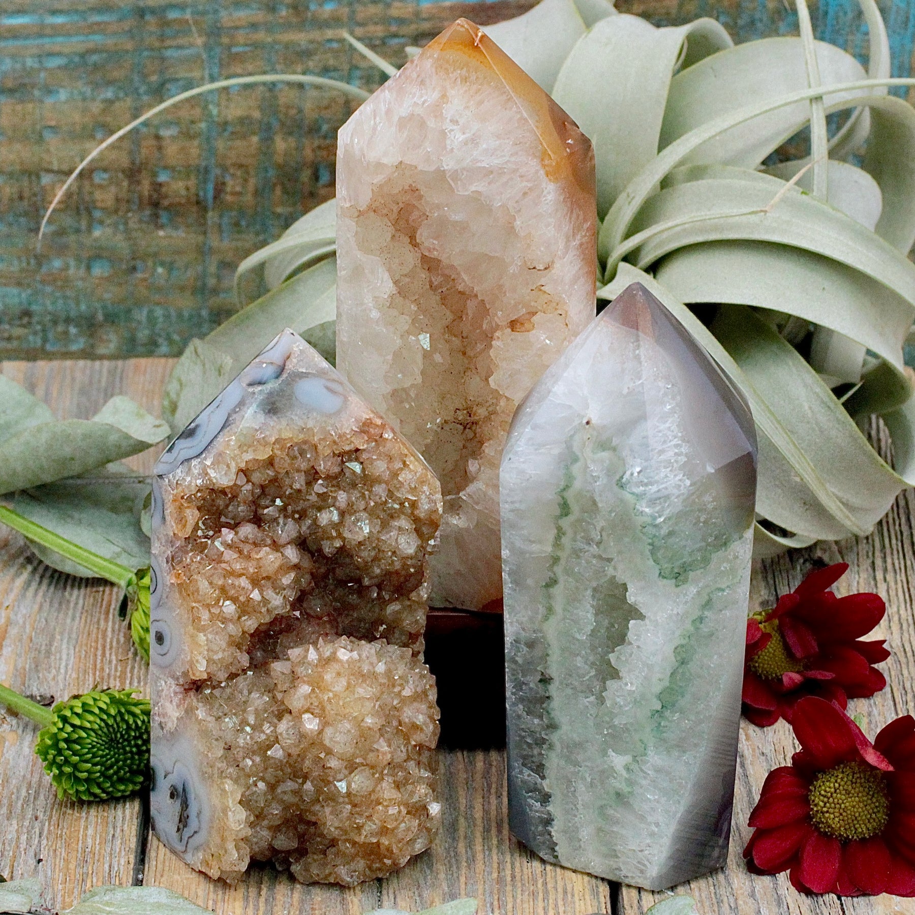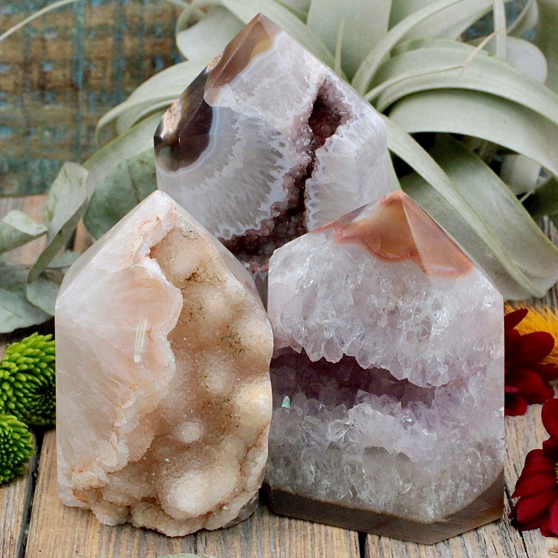 Embark on a serene odyssey to harmony and tranquility through this Agate Druzy Tower. Enchanting and captivating, this crystal fosters grounding, balance, and potent healing energies. Elevate your spiritual voyage today and bask in its mesmerizing aura.