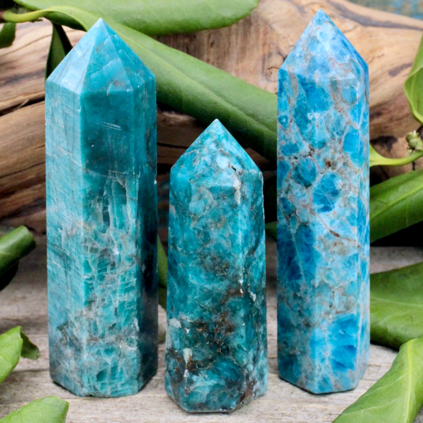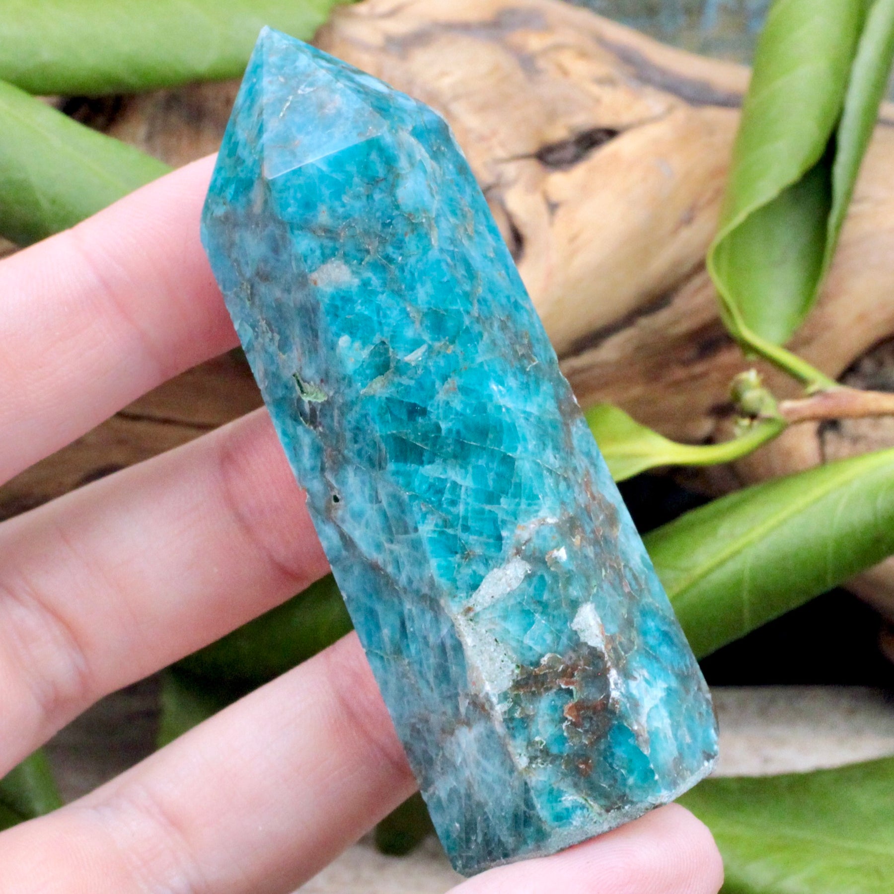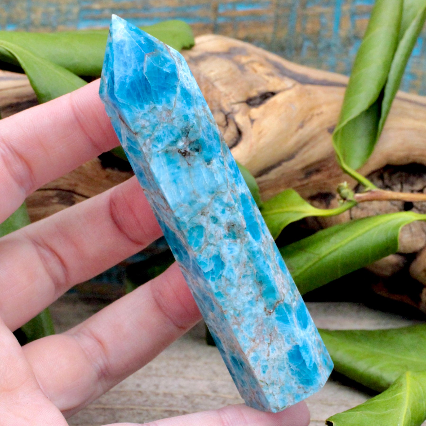 Ignite your inspiration with this Apatite Tower. Displaying a delightful array of blue hues, this charming tower showcases the diverse beauty of apatite. Keep it close to harness the energizing vibes it exudes.