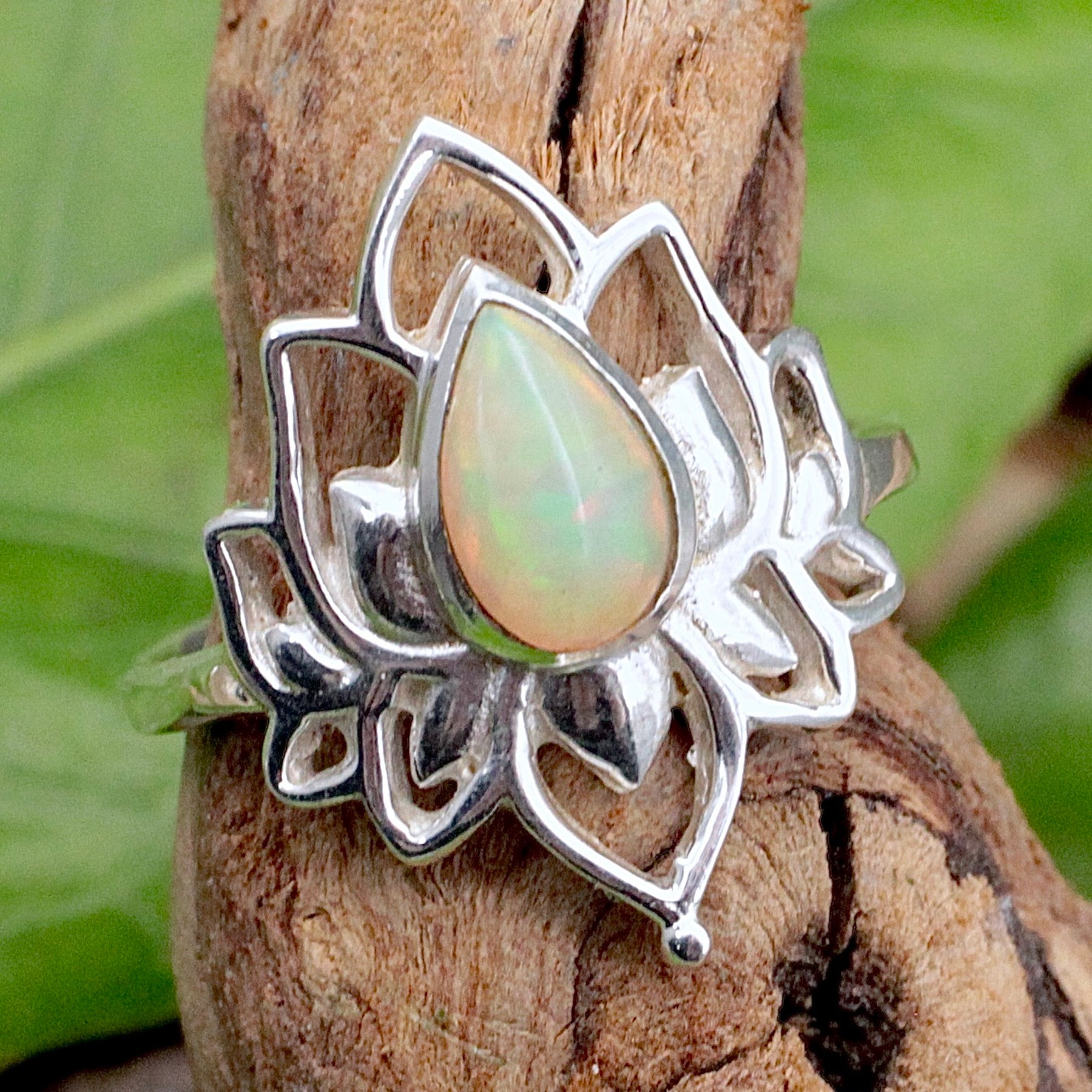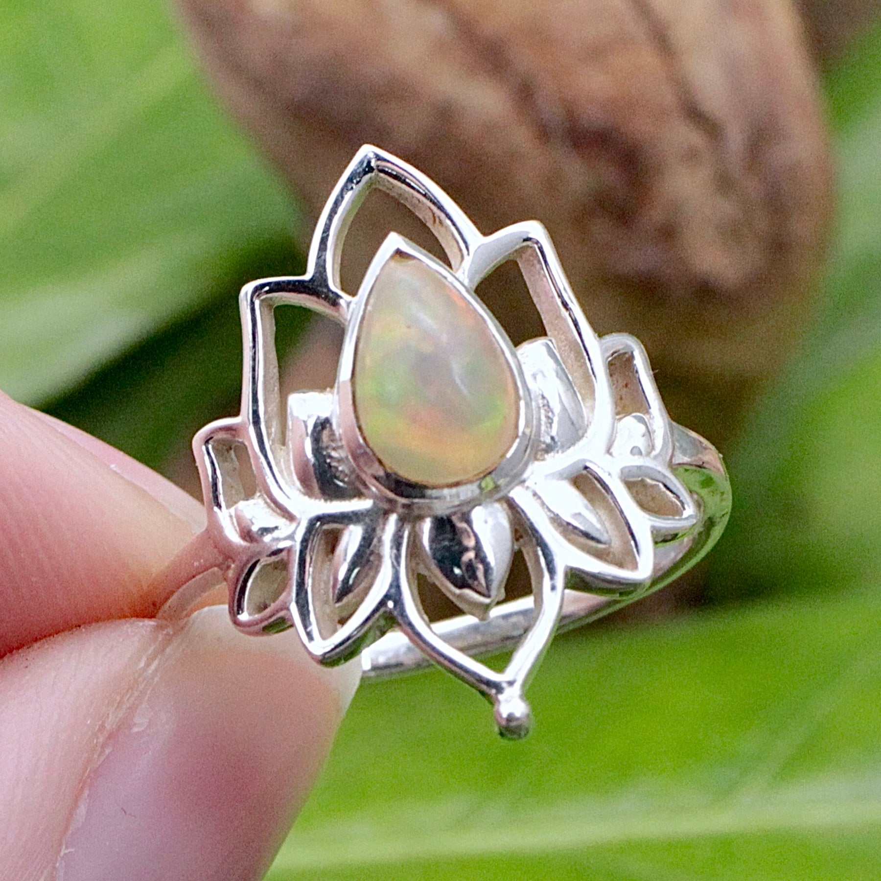 Draw in harmonious energy with this Opal Lotus Ring. Let its captivating opalescent beauty adorn your hand, empowering you on your spiritual path with its radiant energy.