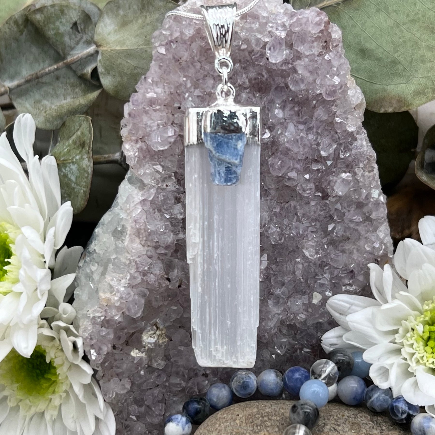 Soft, luminous, and full of gentle clarity, this Crystal Dreams Bundle features a radiant selenite slab crowned with a raw kyanite crystal. The blend of these two stones creates an energy that feels cleansing, peaceful, and spiritually uplifting. Paired with a 6mm sodalite bracelet and a mixed 6mm Angelite, Larvikite, and Quartz Crystal bracelet, this set supports truth, grounding, connection, and emotional calm.