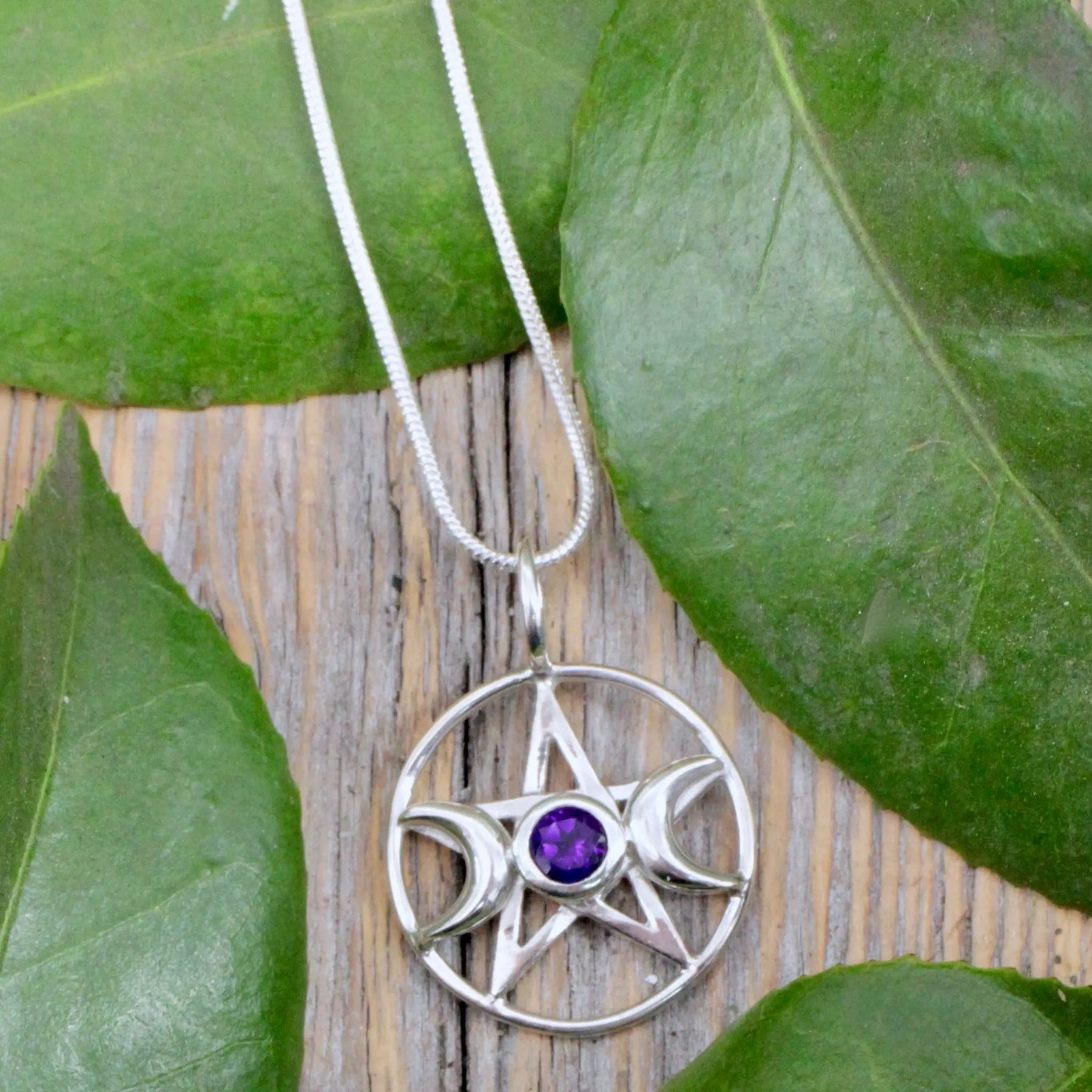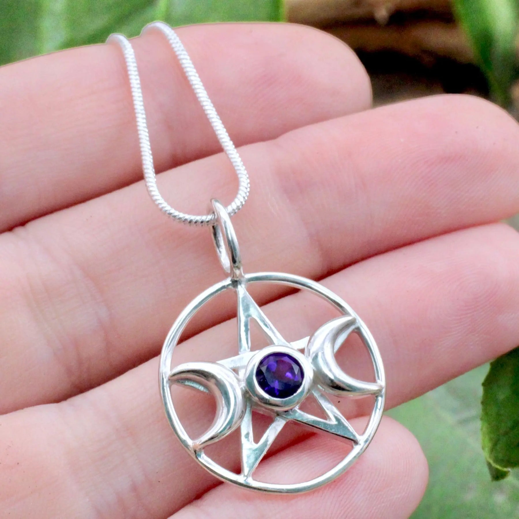 Faceted Amethyst Triple Moon on Star Pendant - Sterling Silver