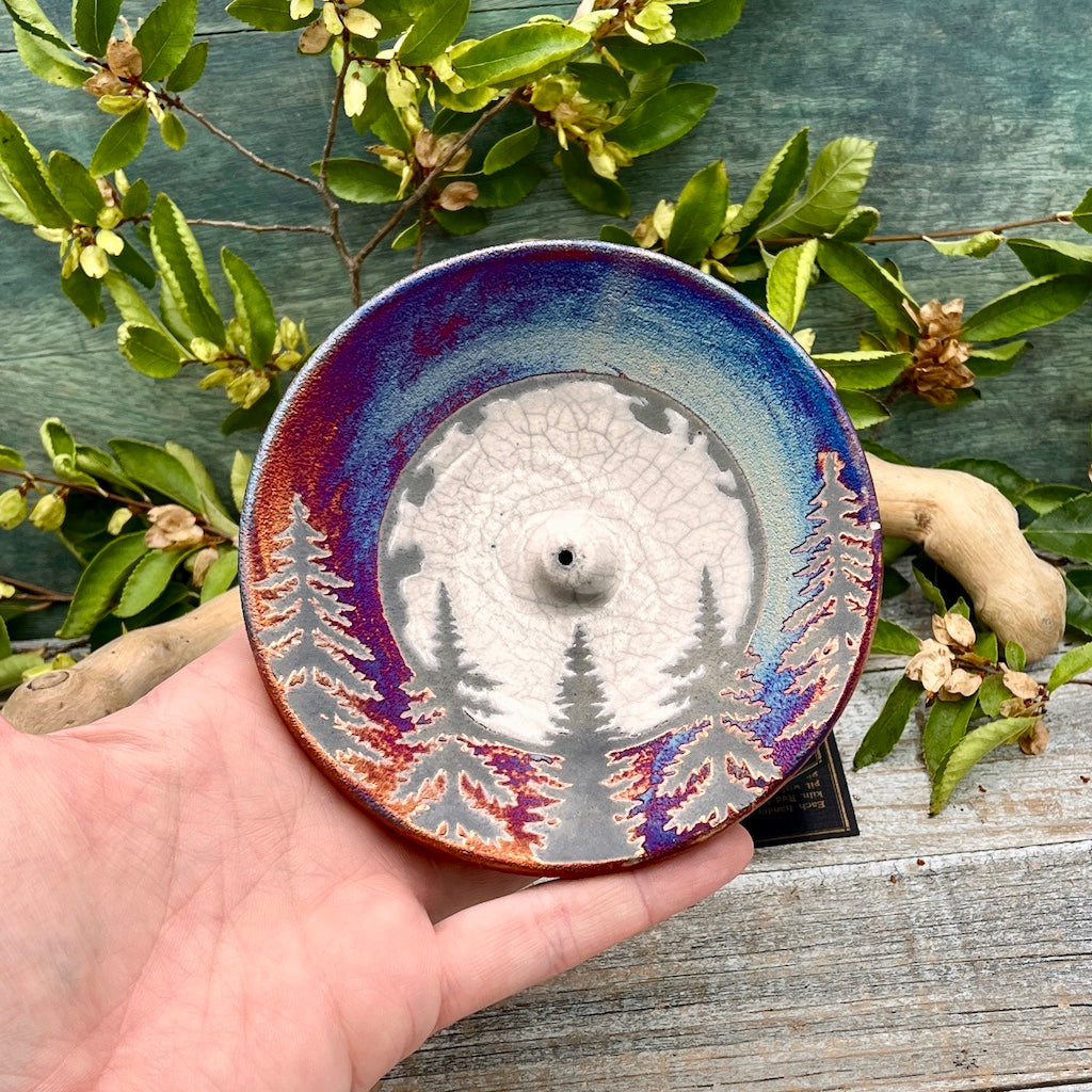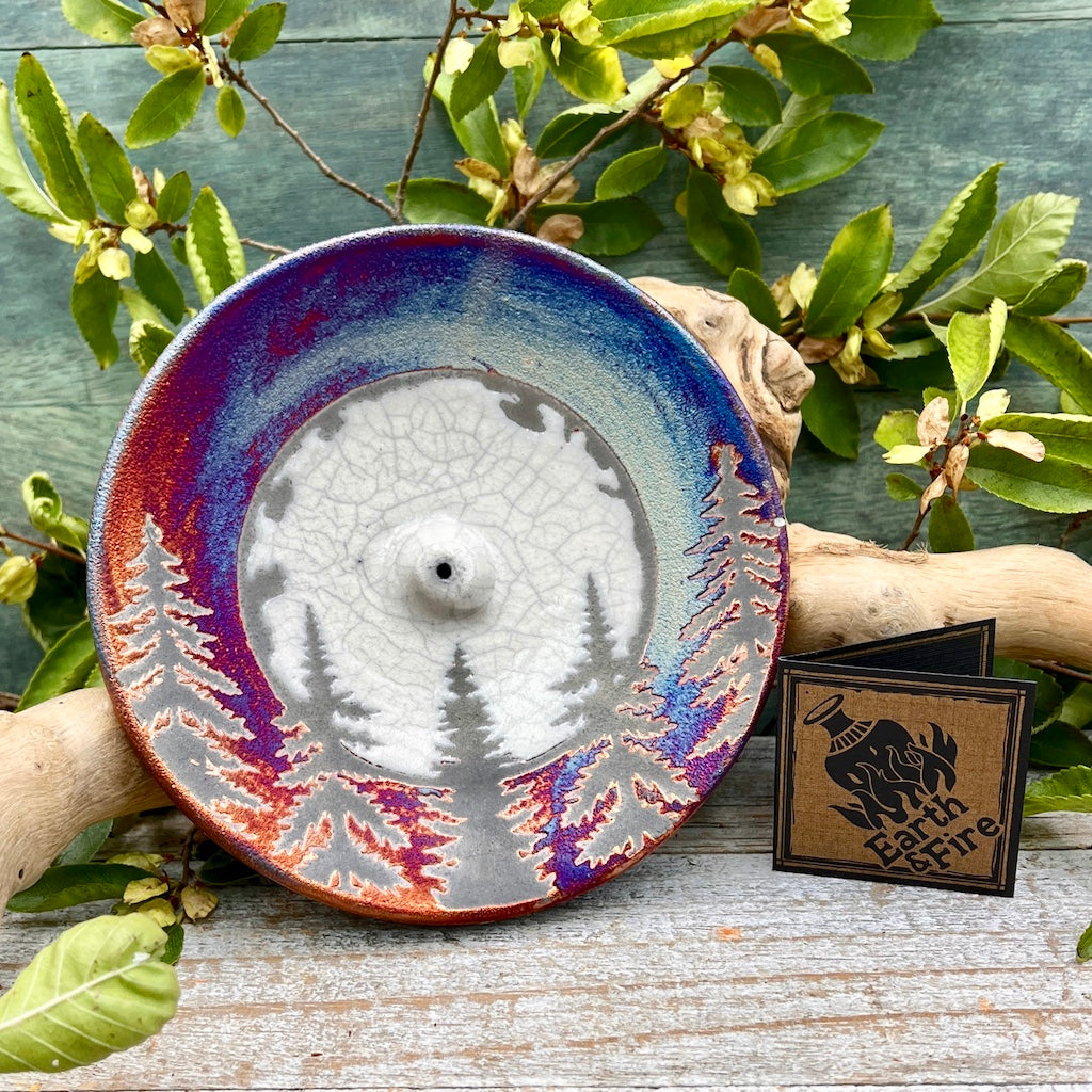 With a wild array of metallic colors, and a forest design, this Raku Pottery piece is the perfect holder for your favorite stick incense. Each incense dish comes with a simple gift box.