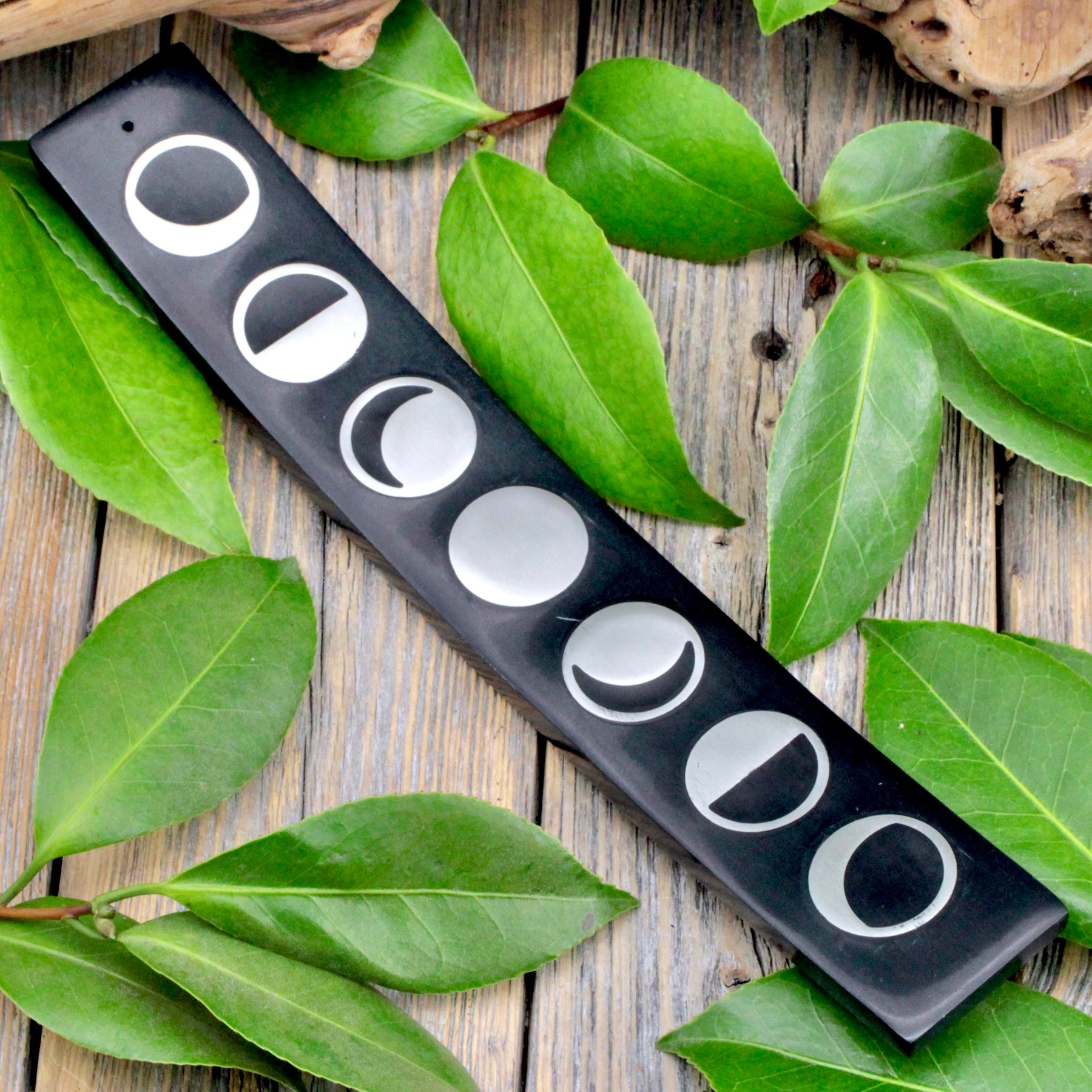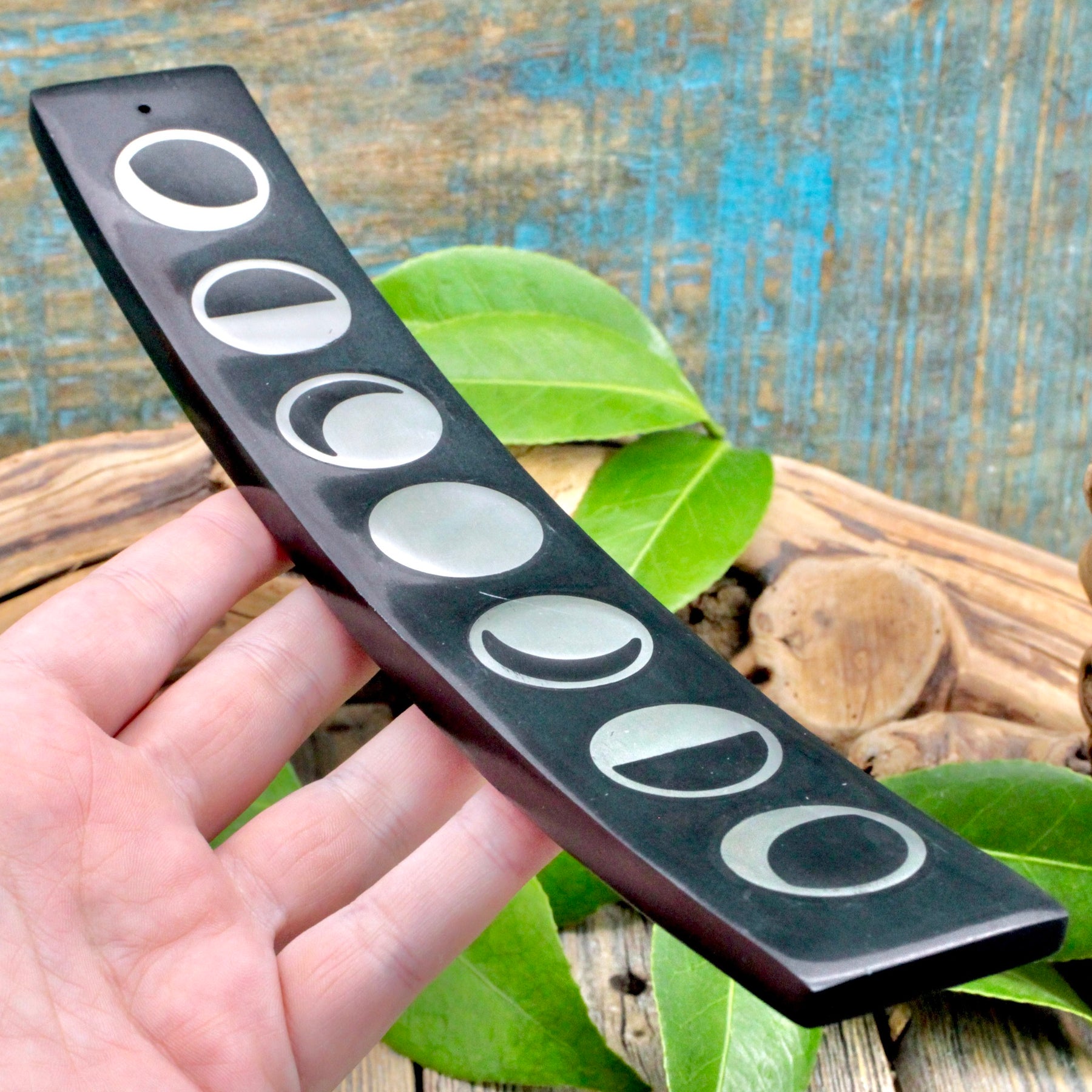Release your stress with this Soapstone Incense Holder with Silver Moon Phases. The sleek design with black and silver coloring is sure to fit into any space and offer tranquil vibrations wherever it is placed.