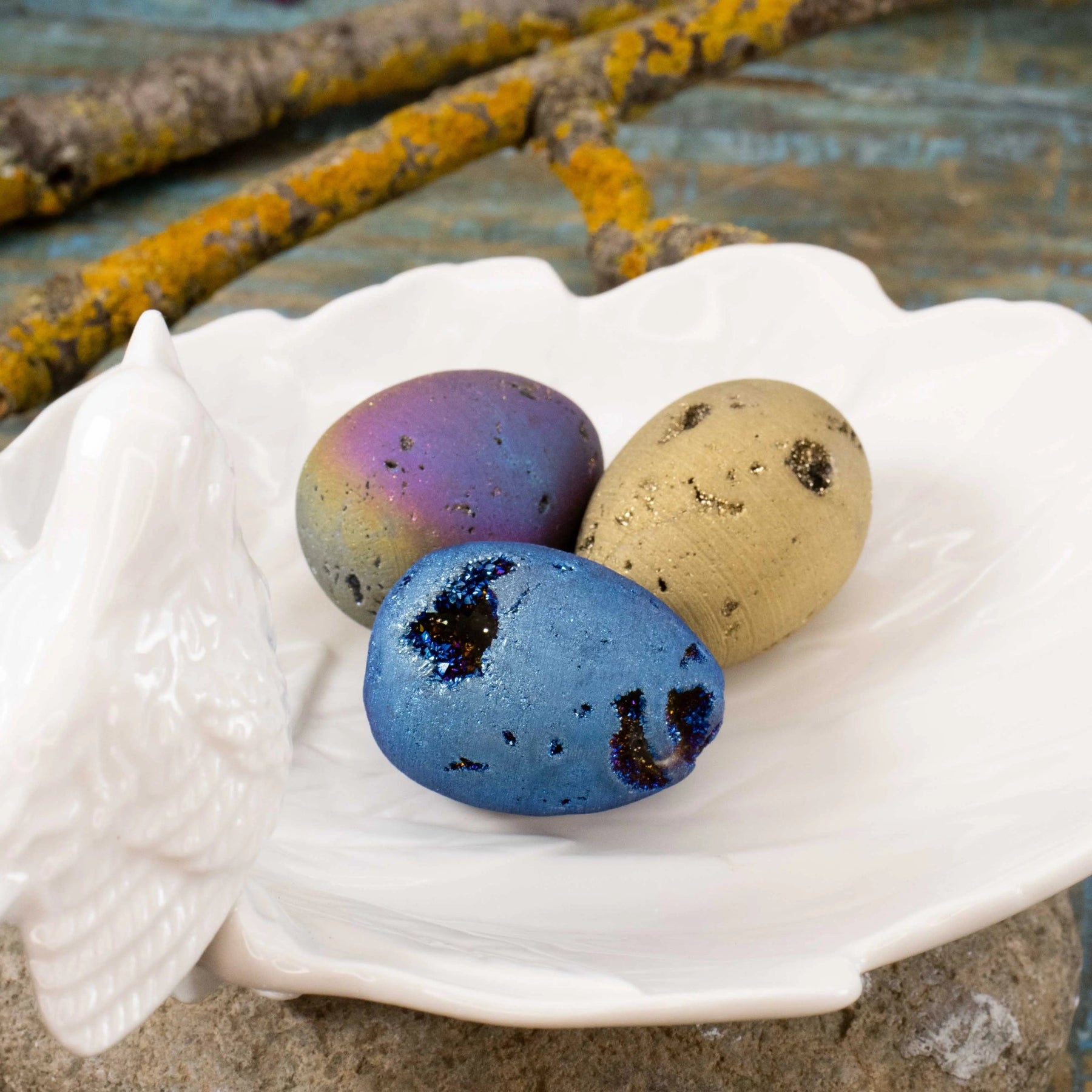 Shimmering, sparkly, sweet little Titanium Sphalerite eggs with druzy inclusions come in rainbow, gold or blue! Collect them all, or watch a loved ones face light up as they unwrap this whimsical gift.