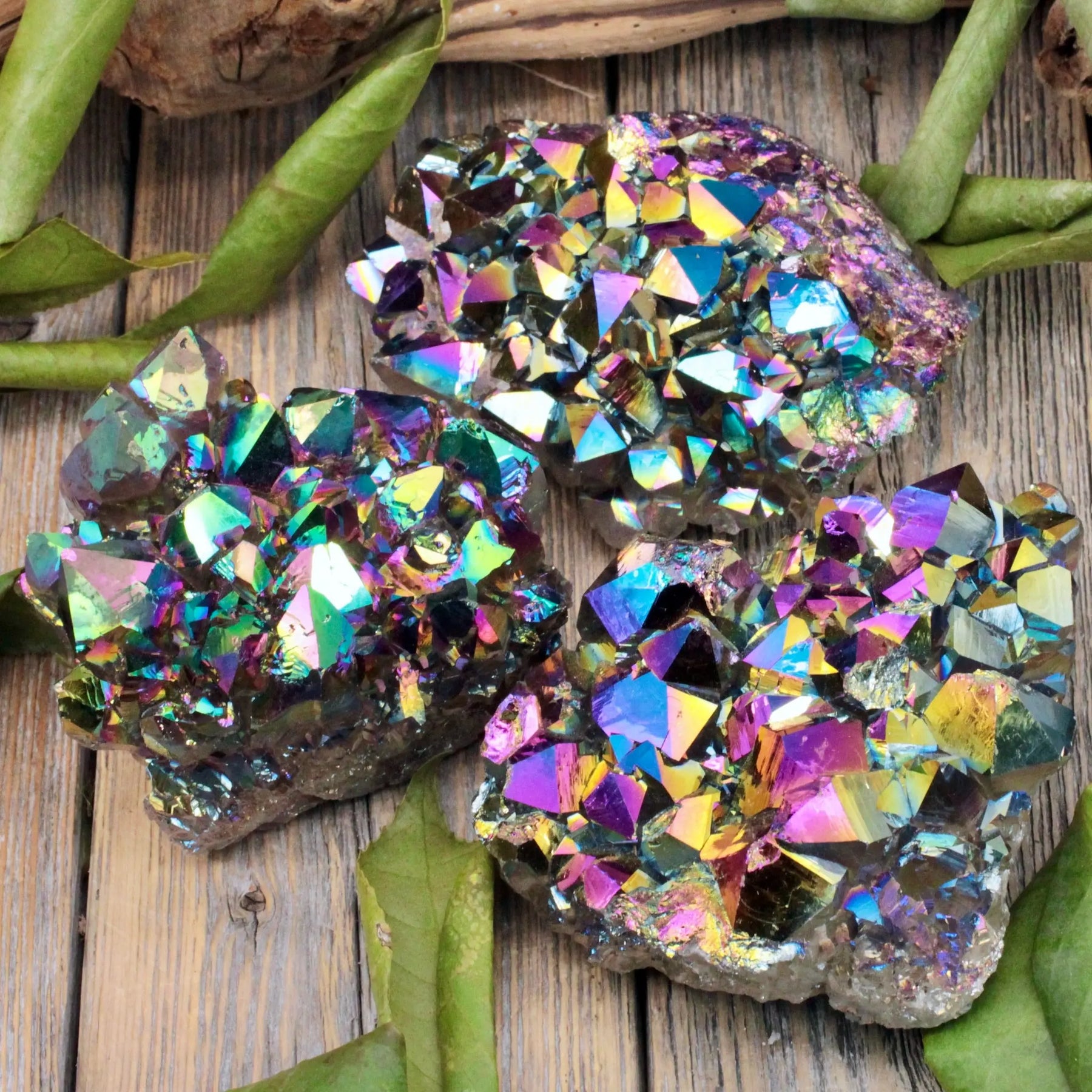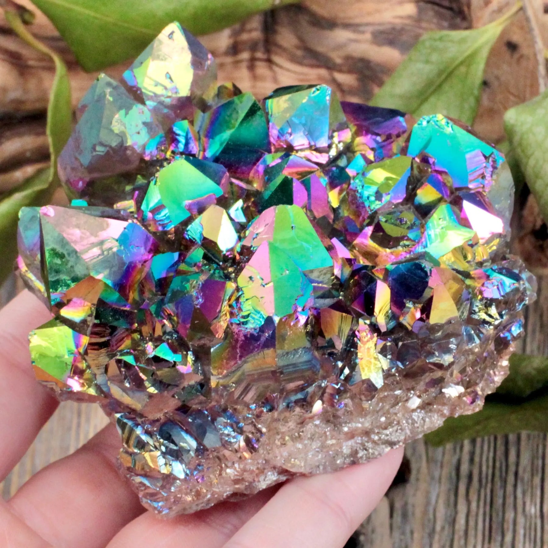 The distinctive rainbow effect activates all our chakras, resonating especially with our solar plexus, offering increased confidence and support to manifest our dreams. The aura effect is obtained through a chemical process that super-heats and transfers ionized particles of precious metal to the crystal's surface, creating a permanent molecular bond and changing the color of the stone. The base stone retains its inherent qualities, and the precious metal enhances the crystal's already high vibration. It encourages connection with our authentic selves, dispelling limiting beliefs and behaviors, and freeing us to explore and embrace new experiences and new ways of seeing the world.