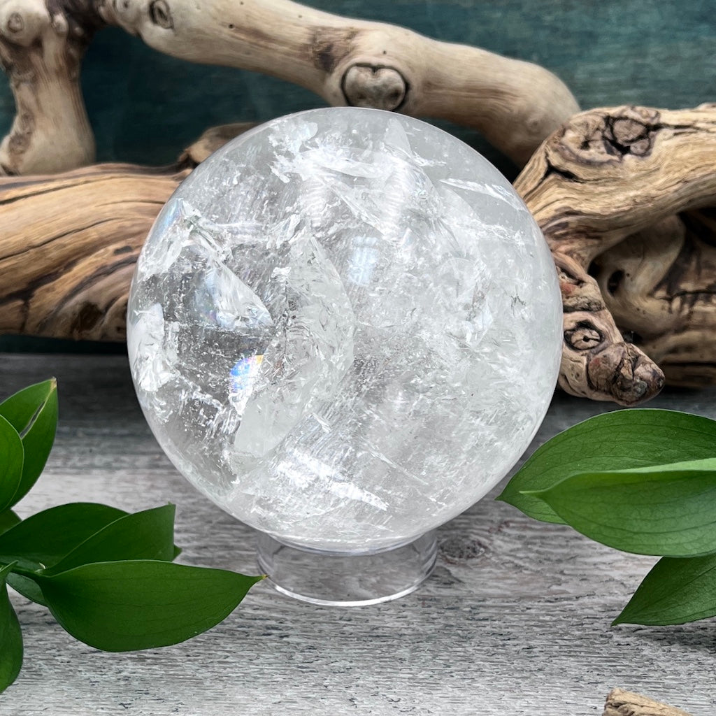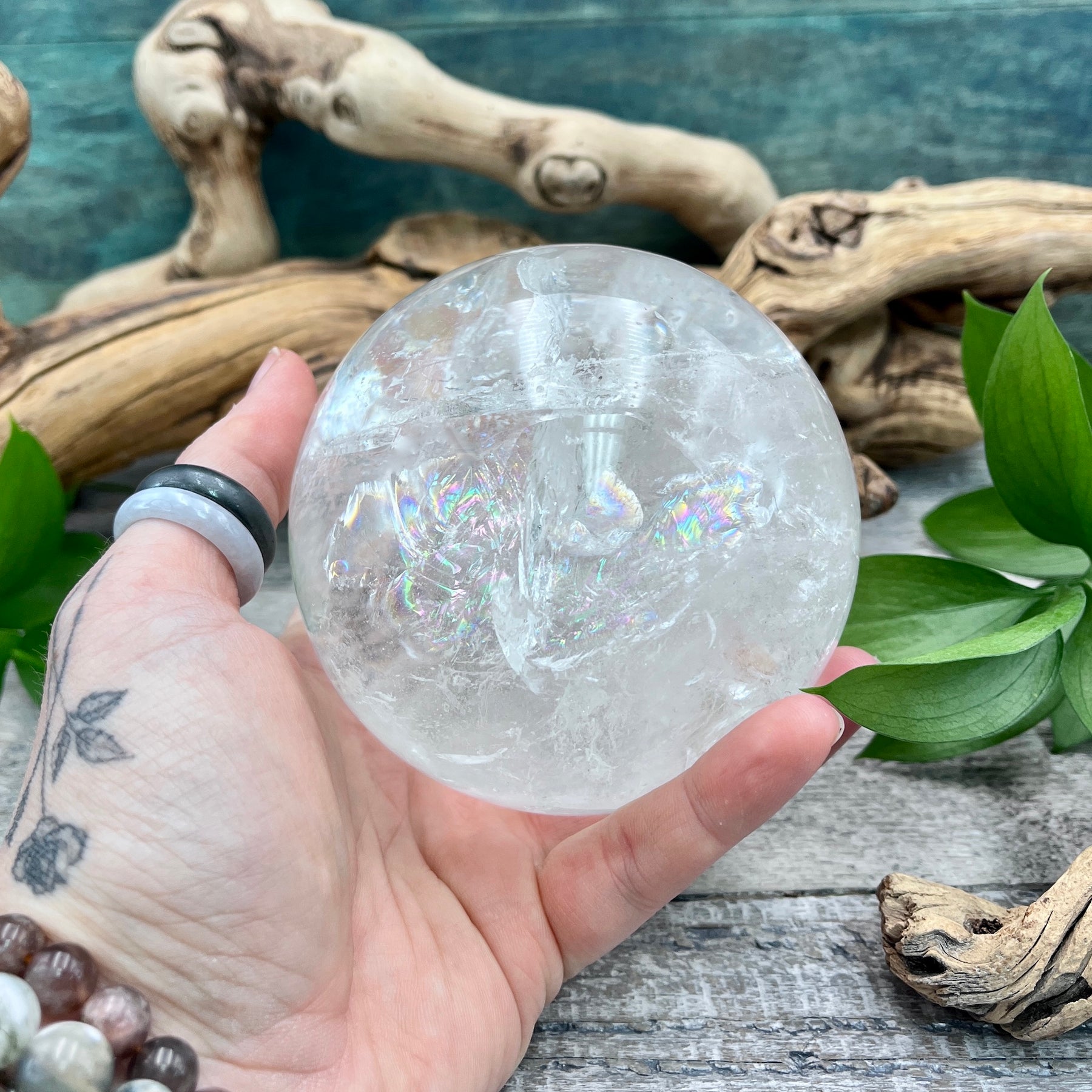 Bring light, joyful positivity into your space with this Quartz Sphere. This large and lovely sphere is so full of rainbows! It catches and plays with the light beautifully and it is sure to be an eye catching part of your collection.