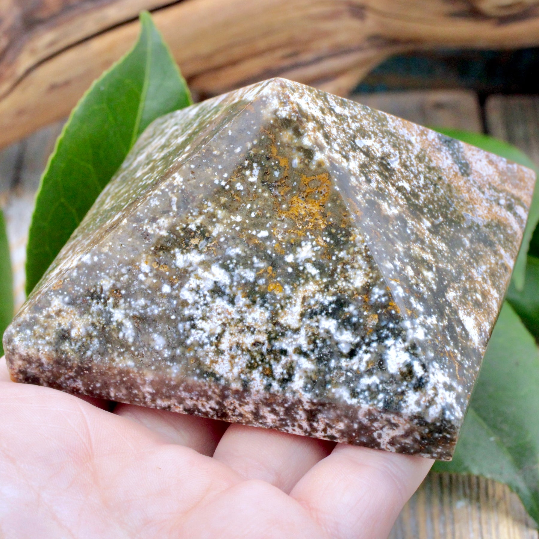 Immerse yourself in the calming essence of this Ocean Jasper Pyramid. With the protective and nurturing energy of this multi-colored stone gracing your home, its ancient mystic knowledge and wisdom can guide you towards inner peace and happiness.