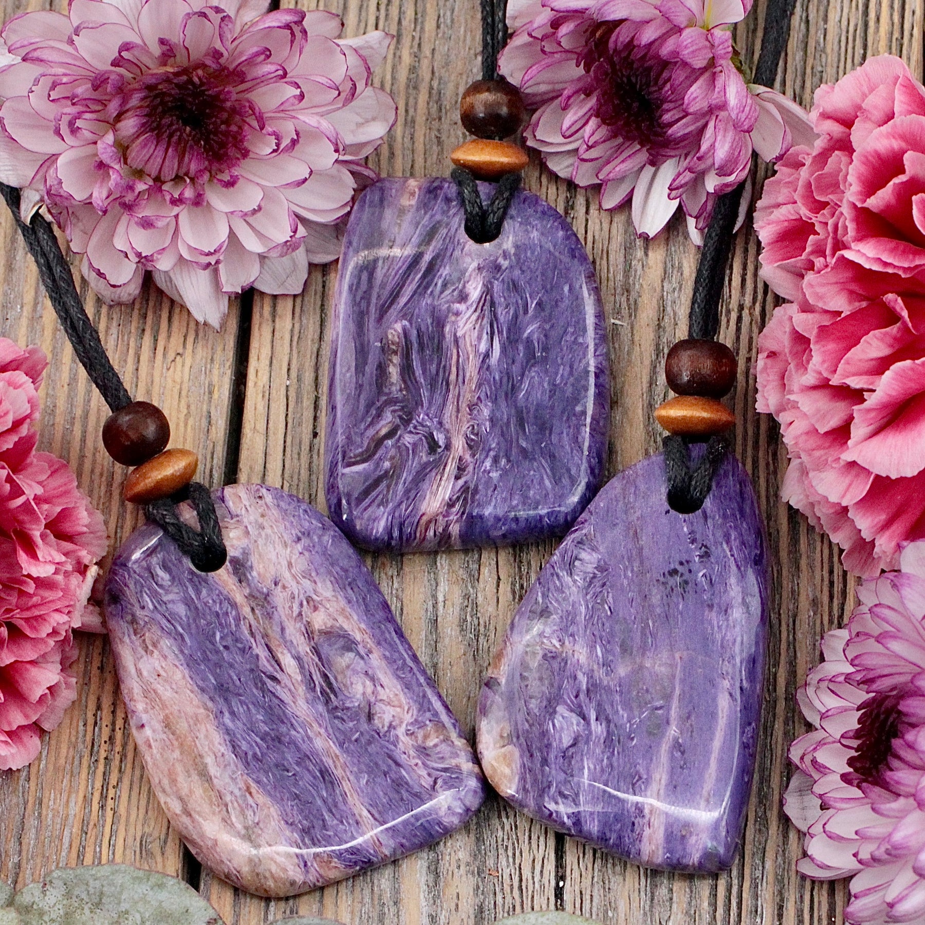 Dissolve negative energy with the transformative power of this Charoite Pendant. The intense purples and blacks of this pendant are a bold statement with any outfit. That same boldness is present in the energy it offers to bring positive energy into the space it occupies.