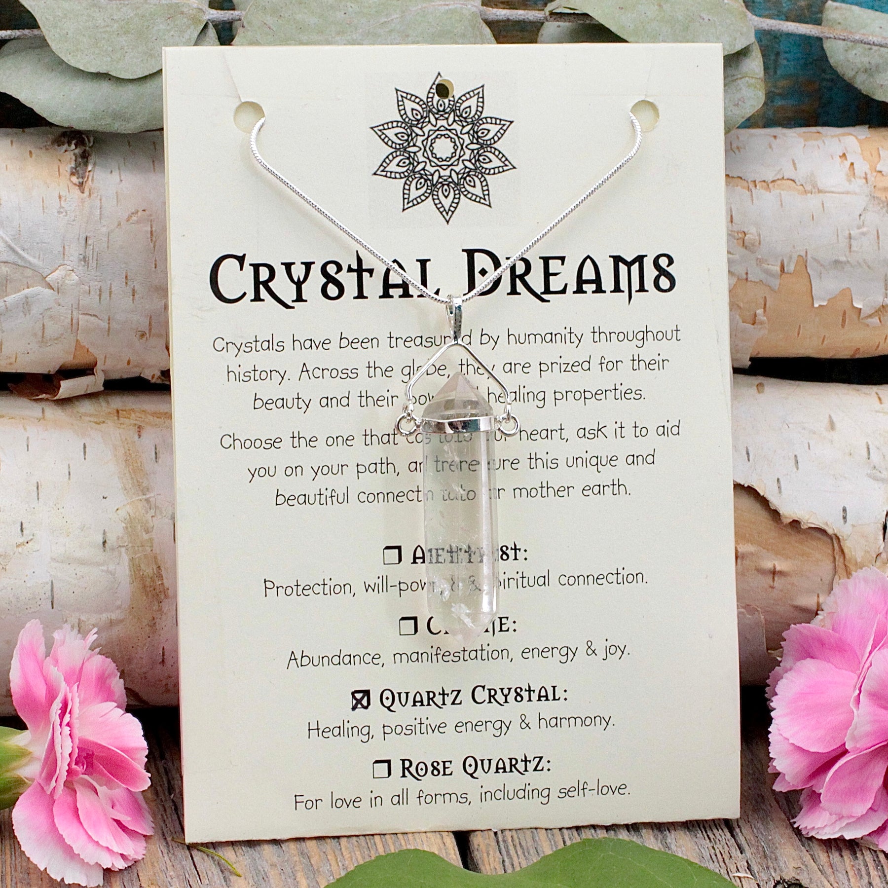 Each pendant in the Stone Circle Studio Crystal Dreams series comes in a lovely gift box that includes a card with the description of the crystal properties.