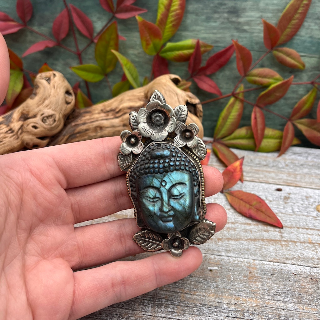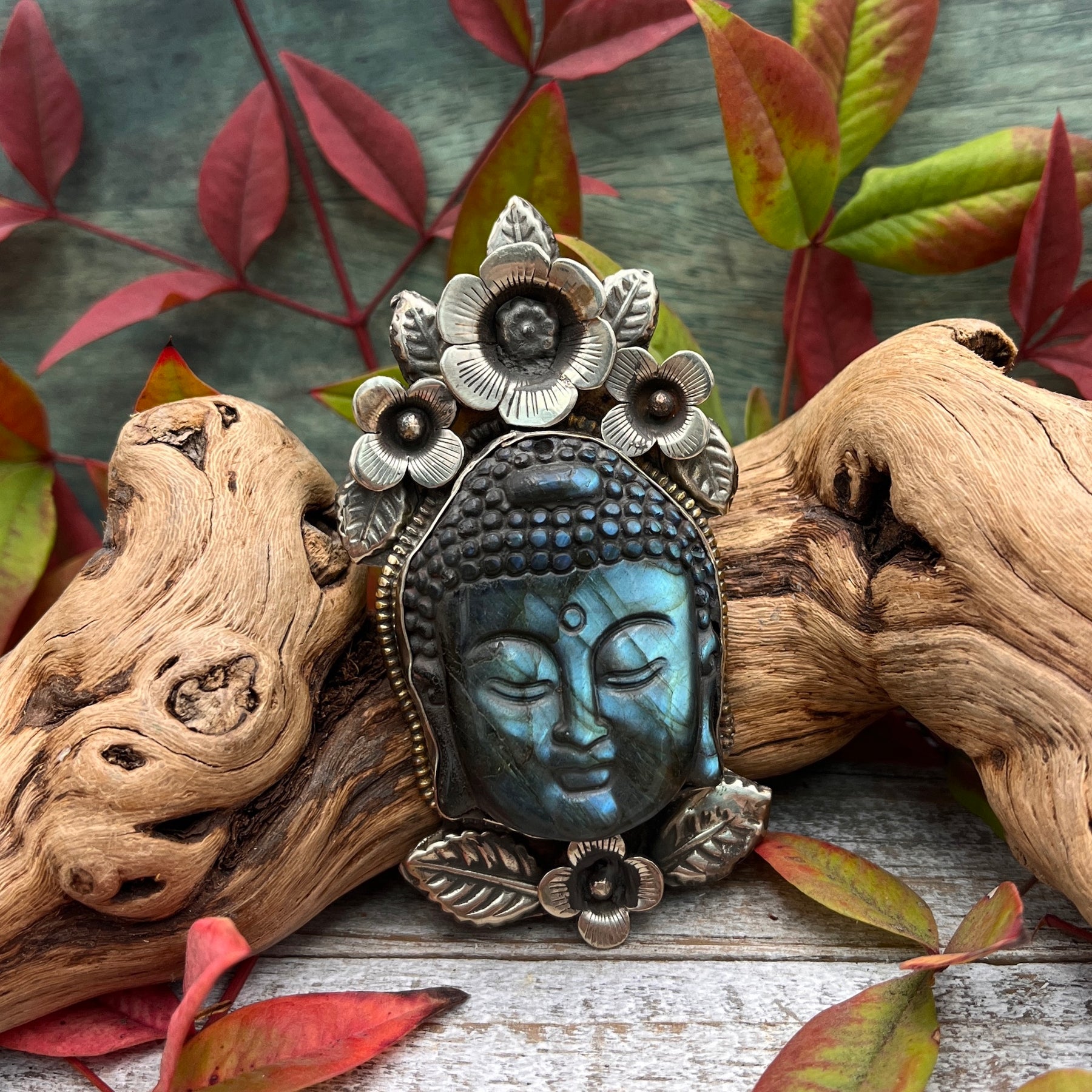 Stimulate your intuition with this Labradorite Buddha Pendant. Done in Tibetan silver work and featuring floral accents, this statement piece makes an unforgettable gift to a loved one (or a lovely treat for yourself!).
