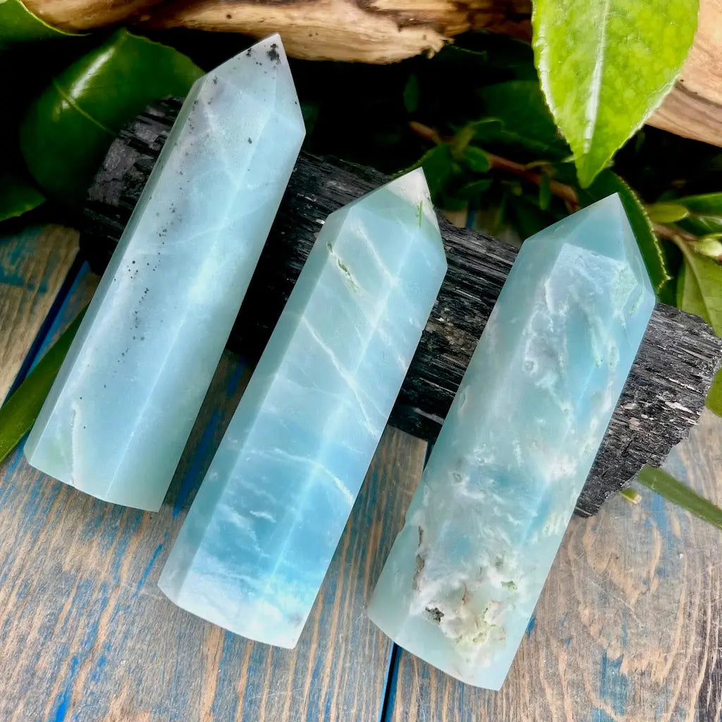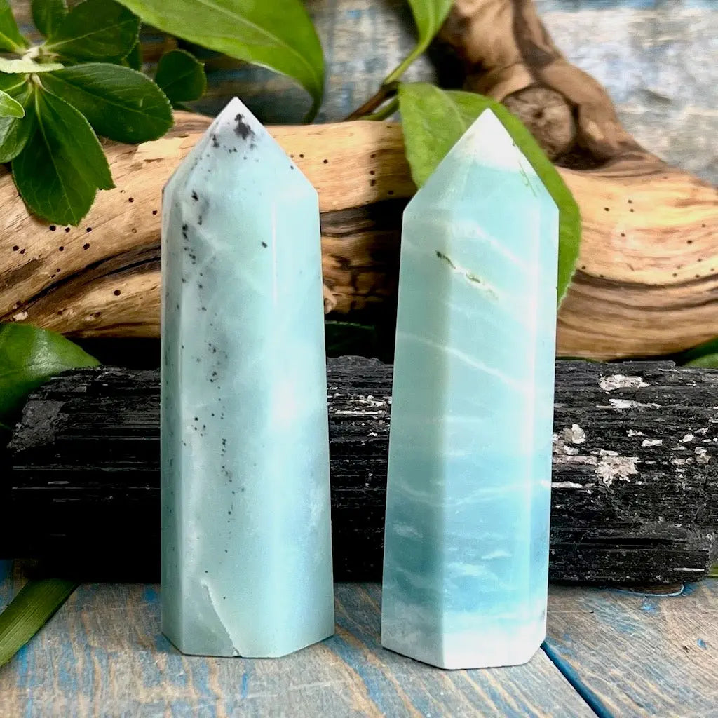 This collection of Amazonite towers is giving us such beachy vibes! The swirls and streaks of creamy white, set against the backdrop of aqua blue is like looking at a beautiful seascape. It's kind of like a day at the beach that you can hold in hand!