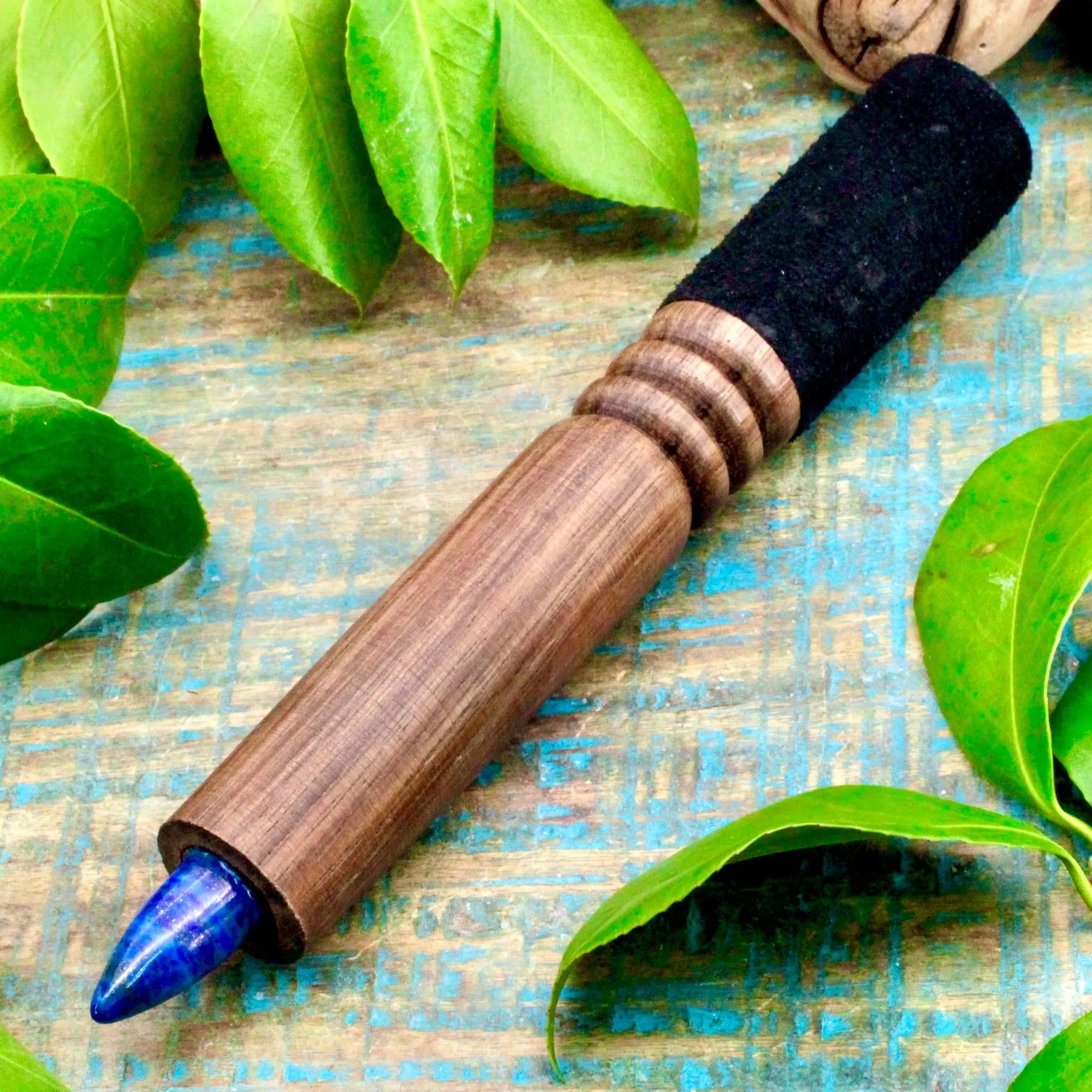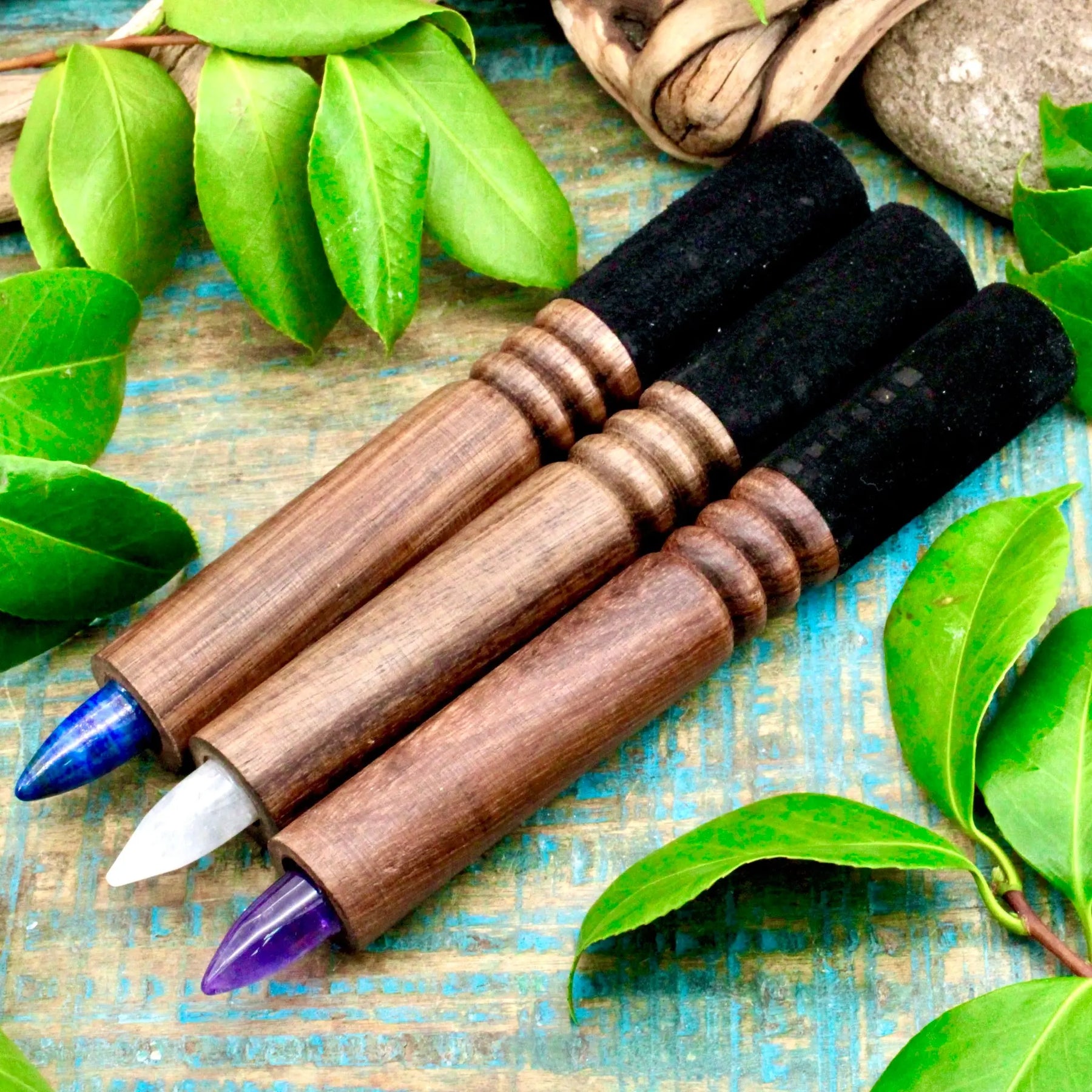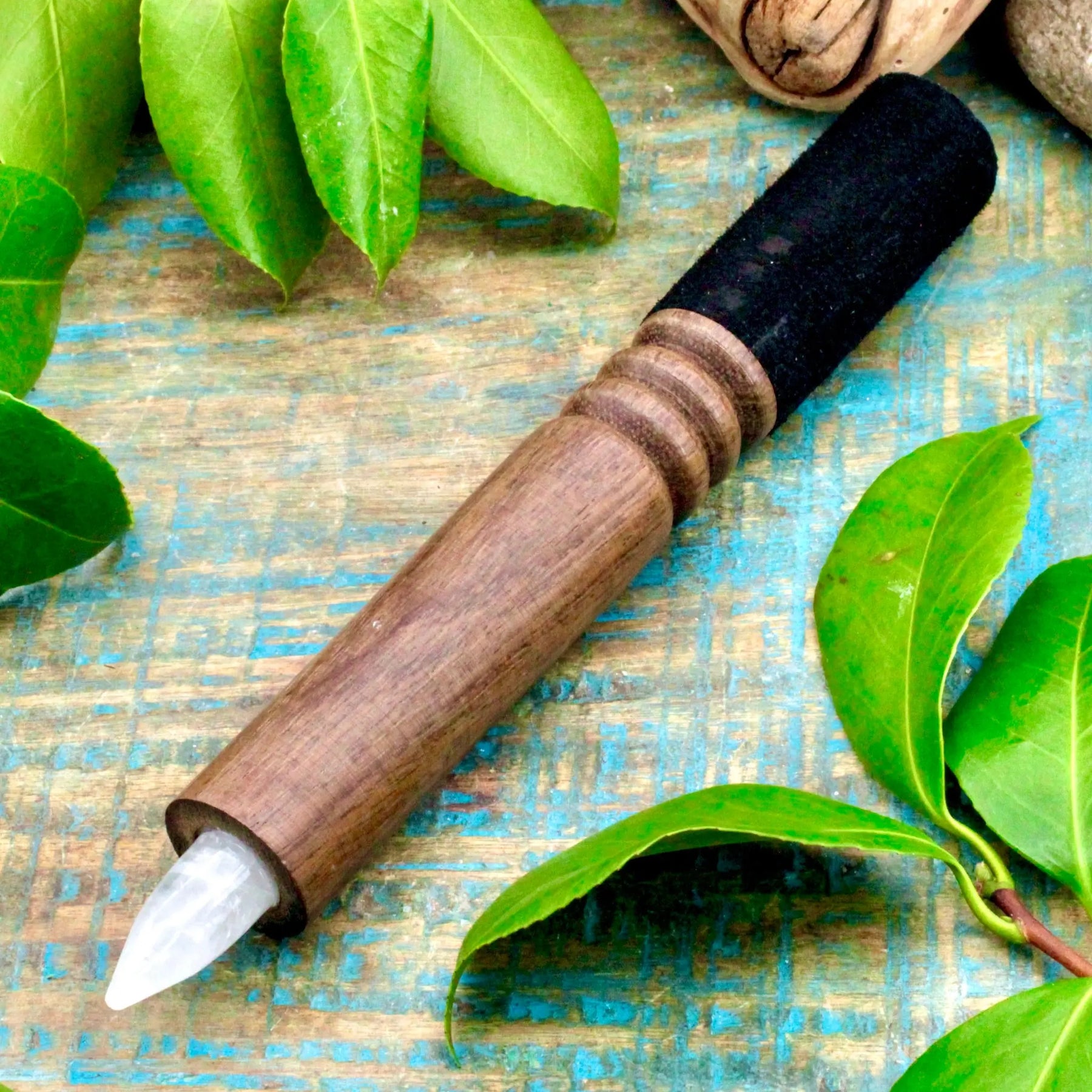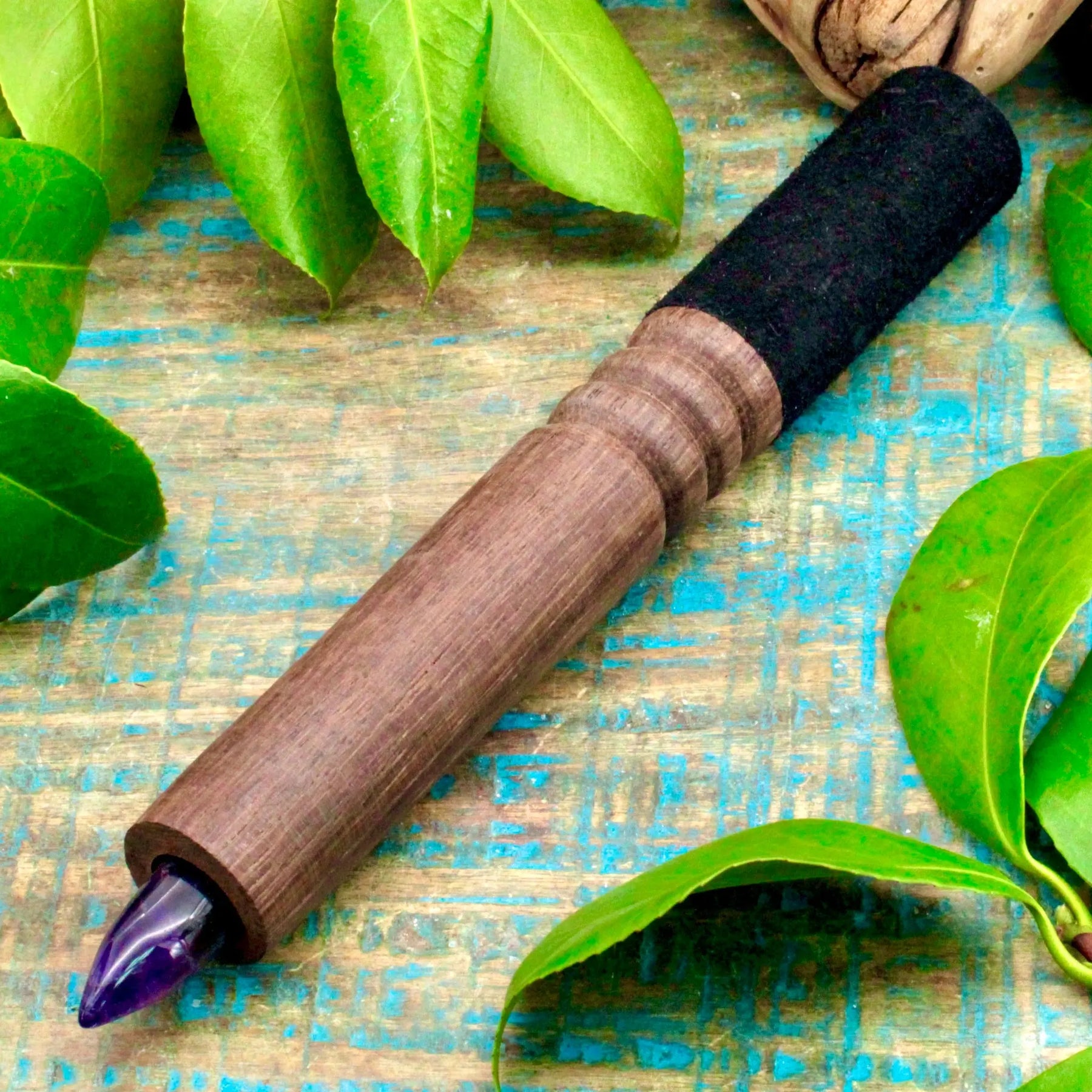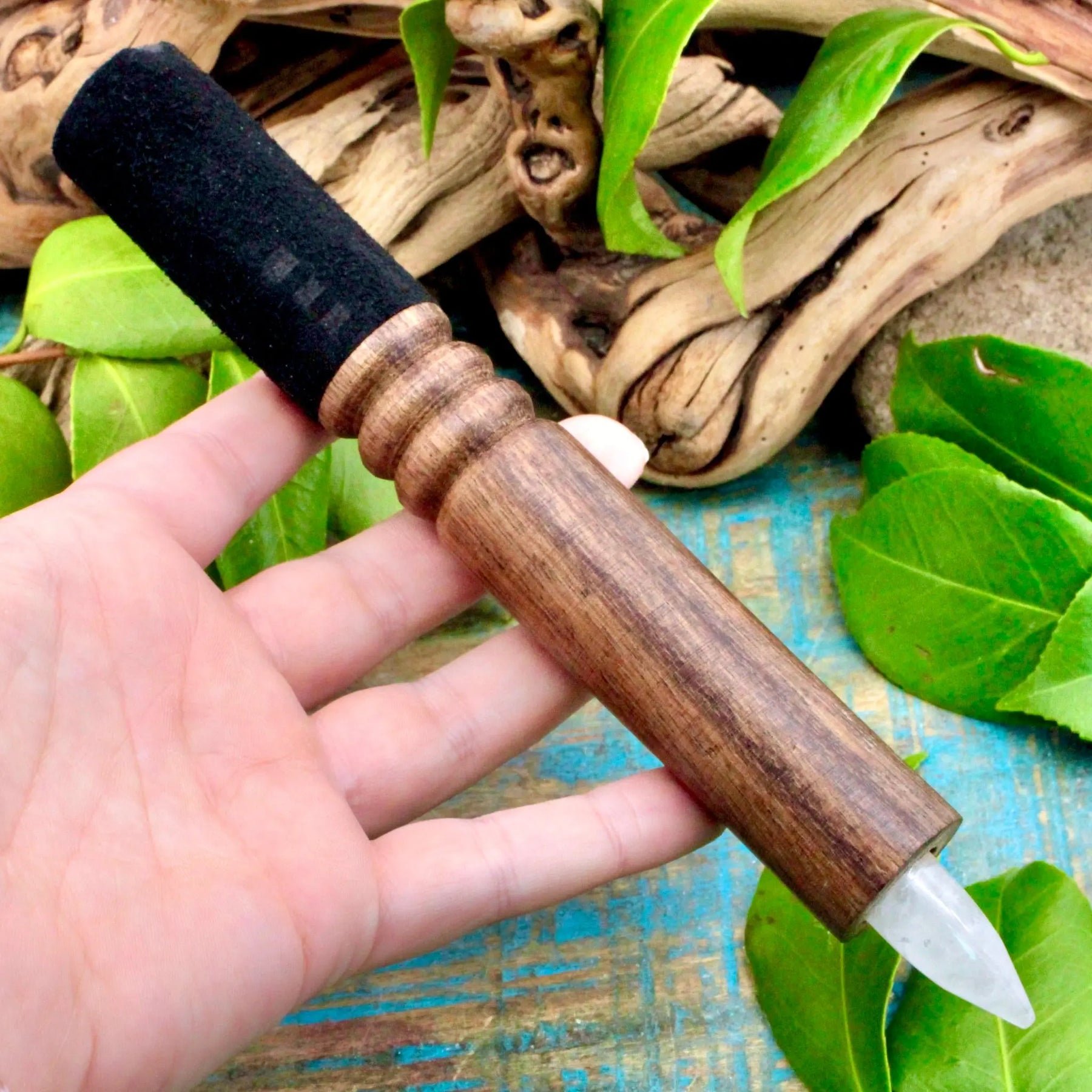 Enhance the vibe of your singing bowl situation with this crystal mallet. This beautiful mallet features a velvety black handle and a crystal point.