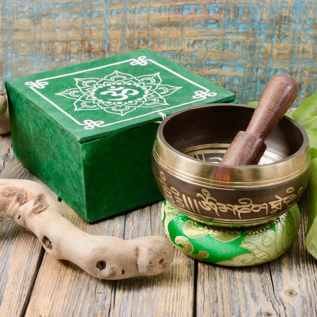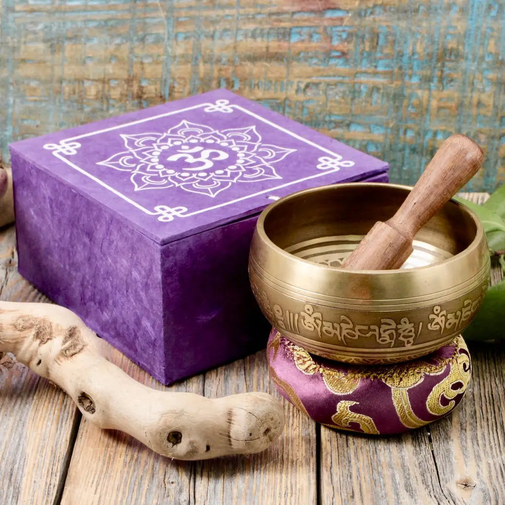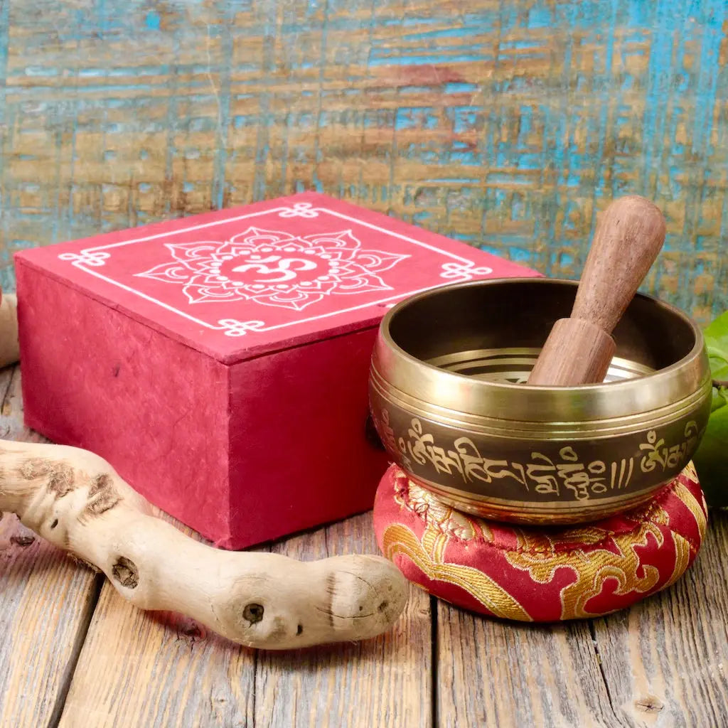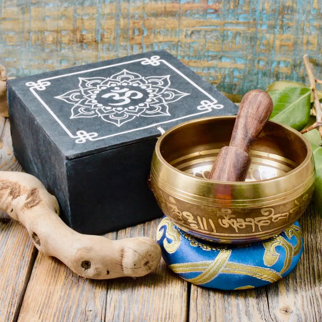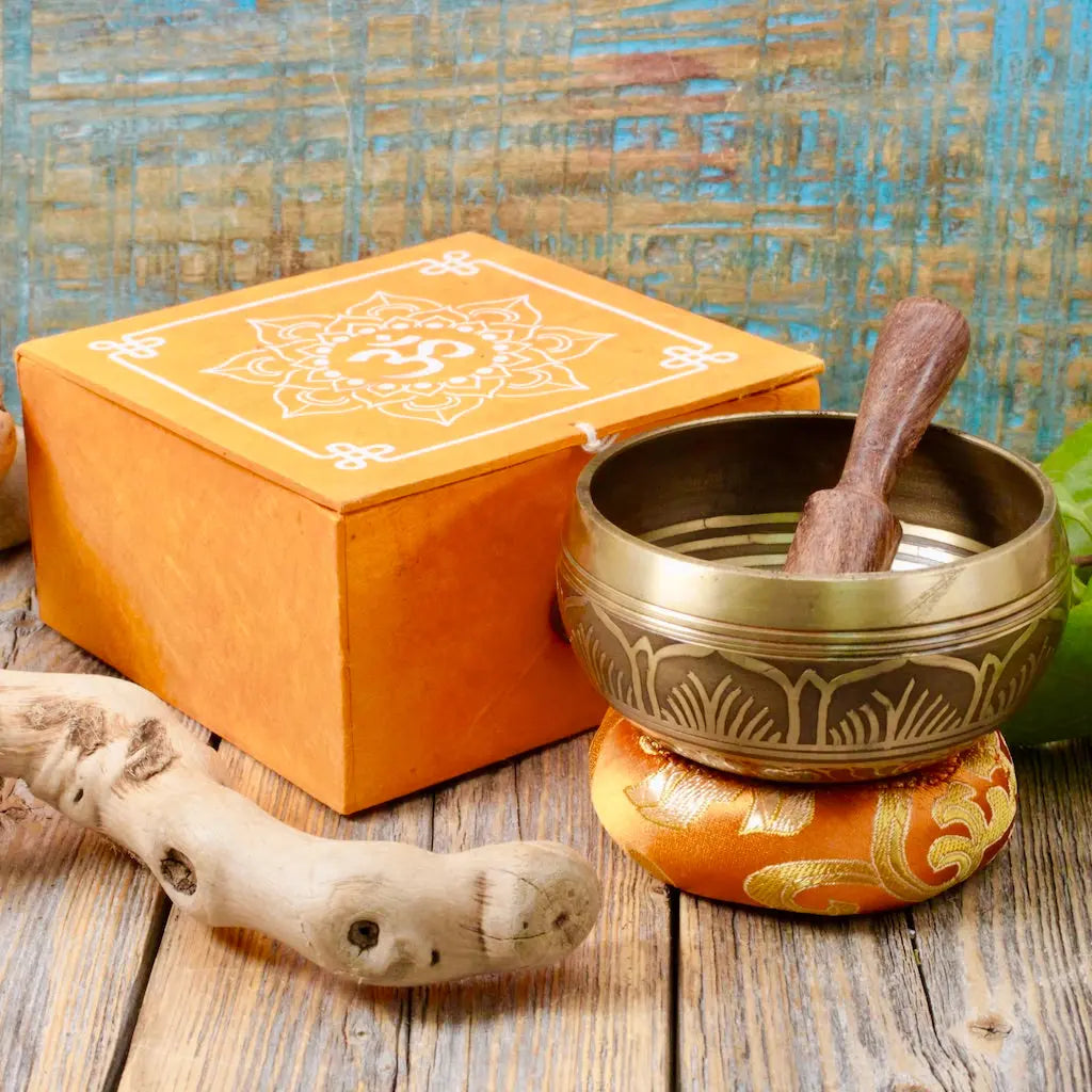 This lovely singing bowl set comes with a well-crafted wooden mallet and a cushion that matches the box, and has vibrant, golden embellishment. The pleasant and rich resonance of this brass bowl is sure to remove any negative energy from your space and reverberate through your body as you soak in its peaceful sounds. The handy box in which it comes also makes a wonderful gift set for loved ones.