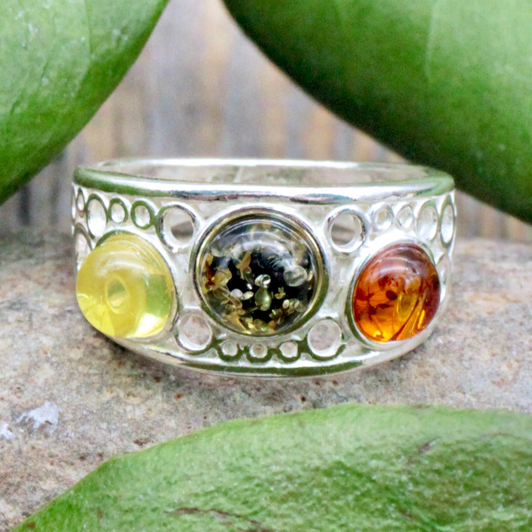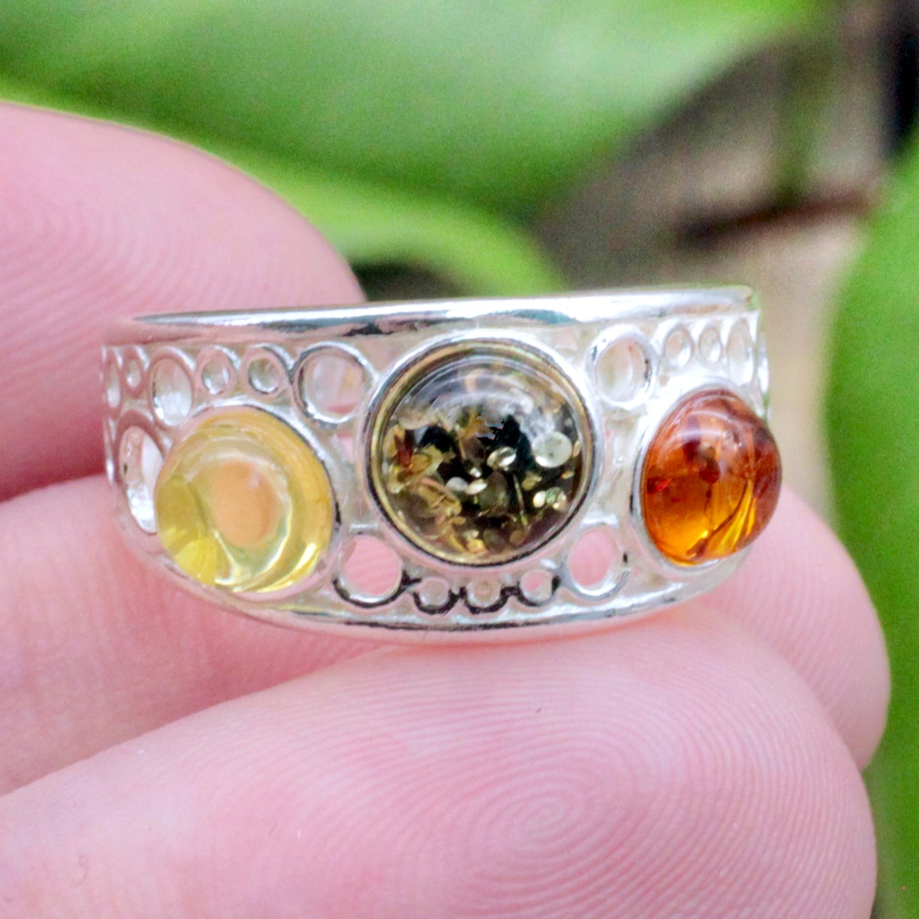 Welcome an aura of grounded stability with this Amber Tri-Color Ring. Let the captivating beauty of this exquisite golden Amber effortlessly complement a myriad of outfits, infusing your style with its timeless charm. This precious relic from the past serves as a bridge between eras, offering you a unique and enduring connection.