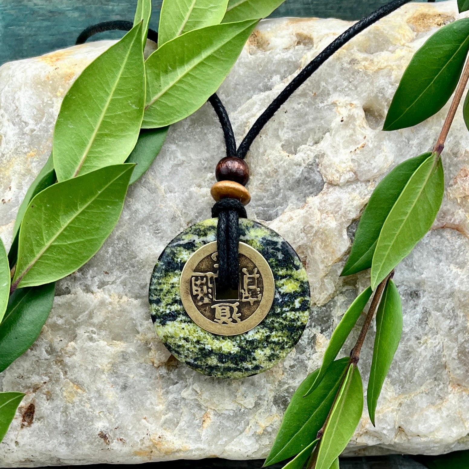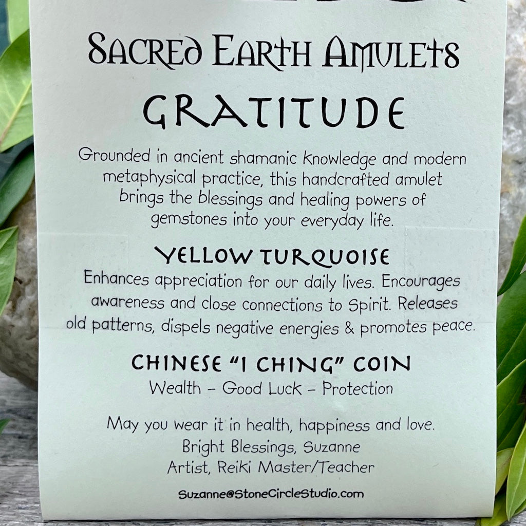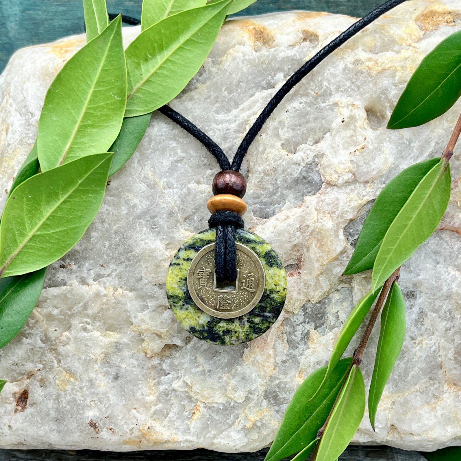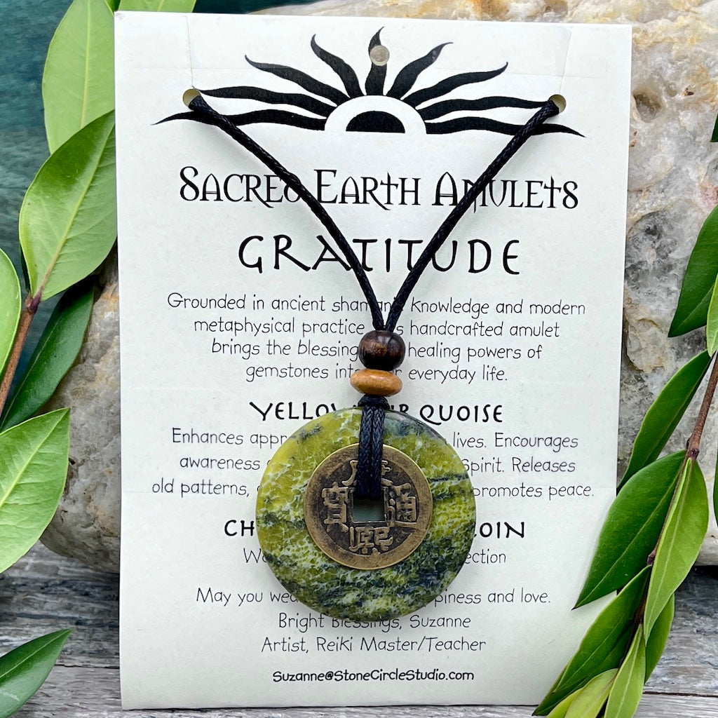 Find a renewed zest for life with this Gratitude Yellow "Turquoise" Jasper Necklace. As part of our Sacred Earth Amulet collection, this piece combines the energy of the stone with the symbolism of the Chinese "I Ching" coin which brings in wealth, good luck, and protection.