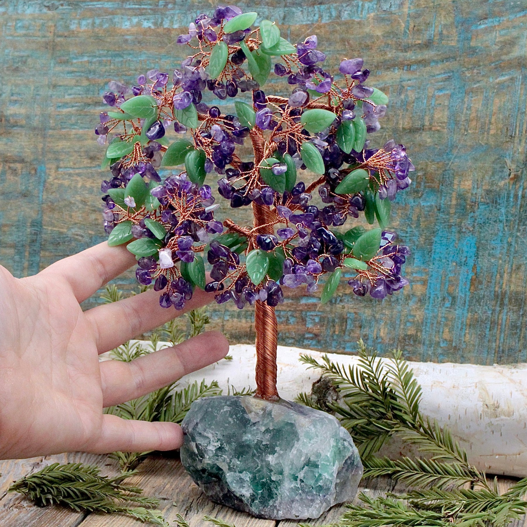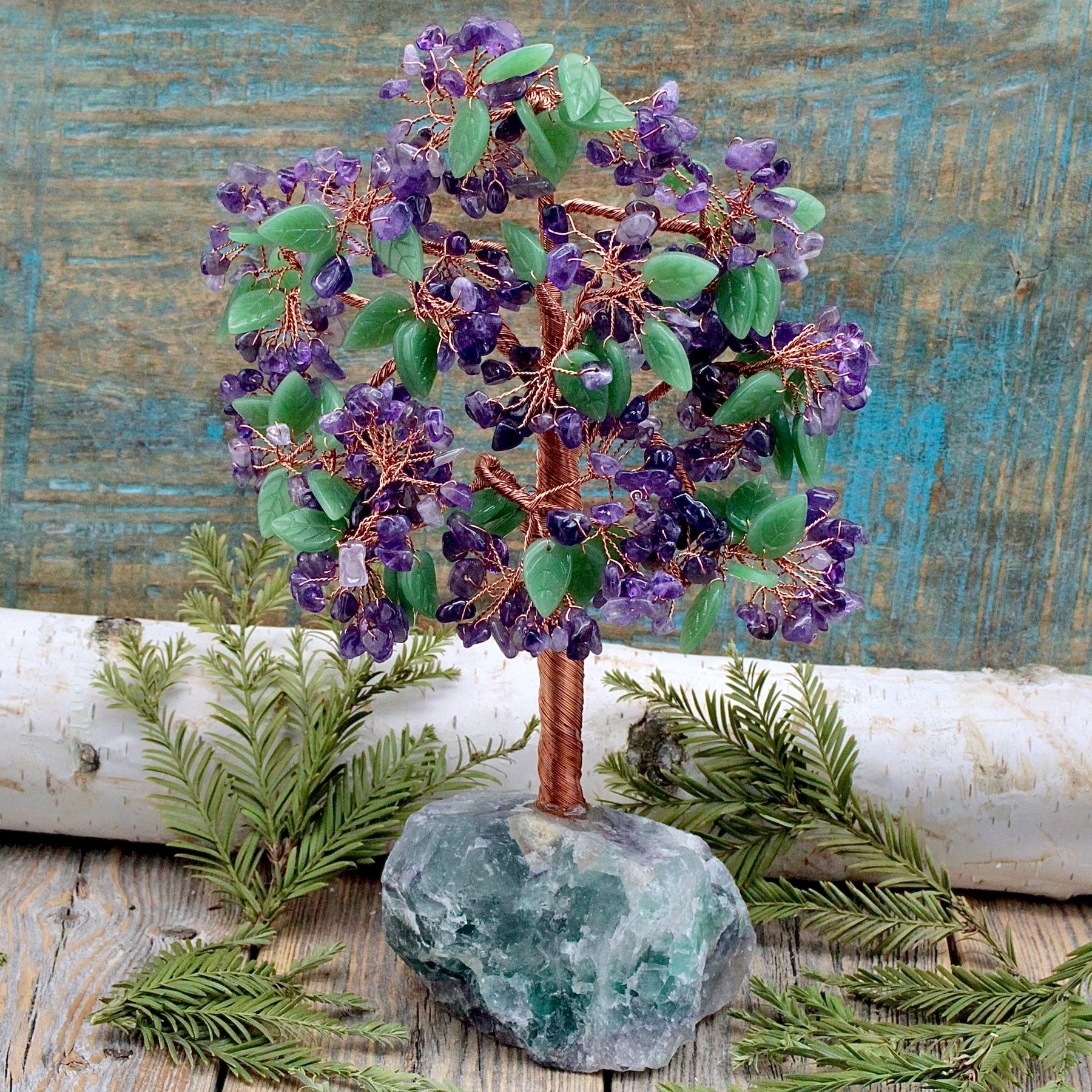 Enhance your decor with this Amethyst and Green Aventurine Gemstone Tree on Fluorite Base. This stunning piece combines the soothing energy of Amethyst with the prosperity of Green Aventurine, all grounded on a stabilizing Fluorite base. Ideal for adding elegance and positive vibes to any space.