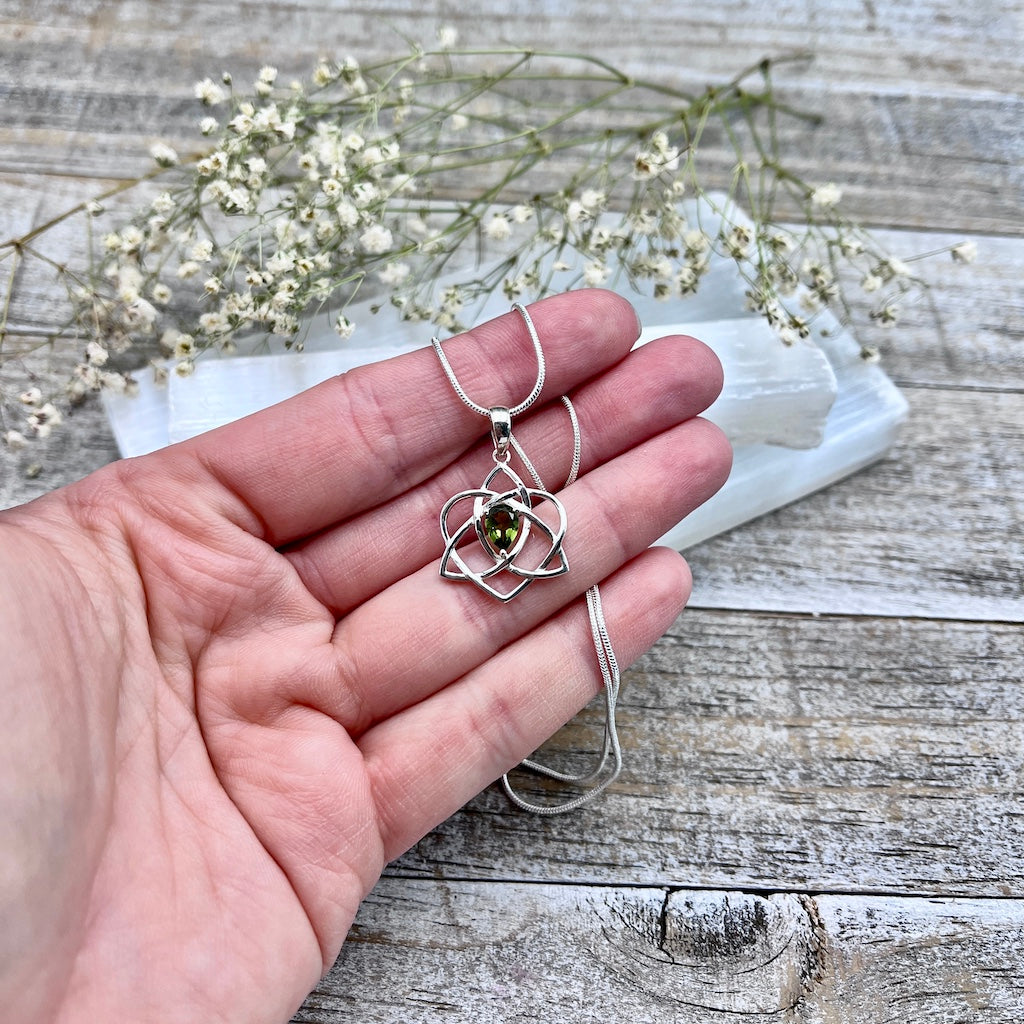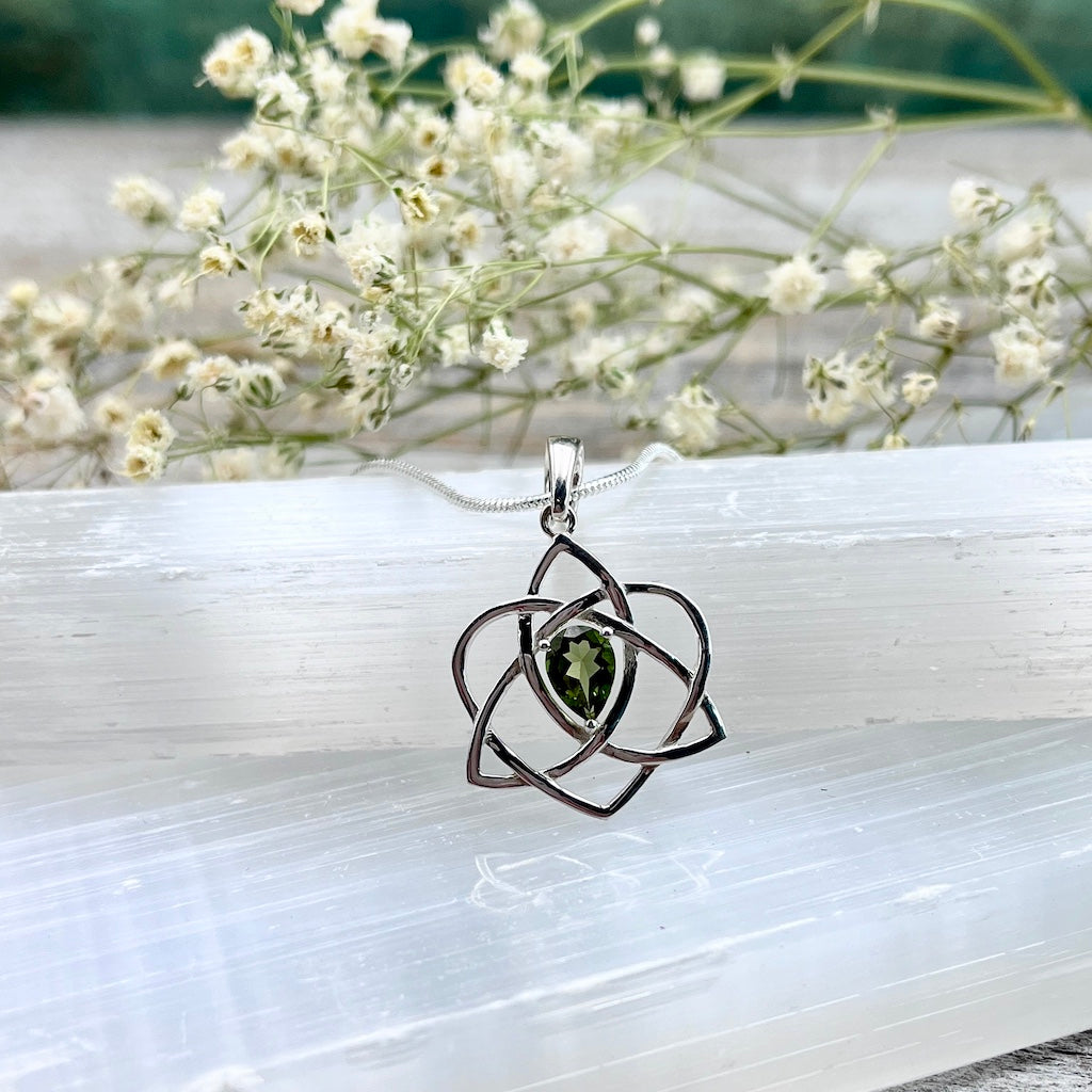Take your energies to the next level with this Faceted Moldavite Triquetra Necklace. Set into sterling silver, this dainty pendant packs a powerful spiritual punch, and it's ready to help you on your journey through this life.