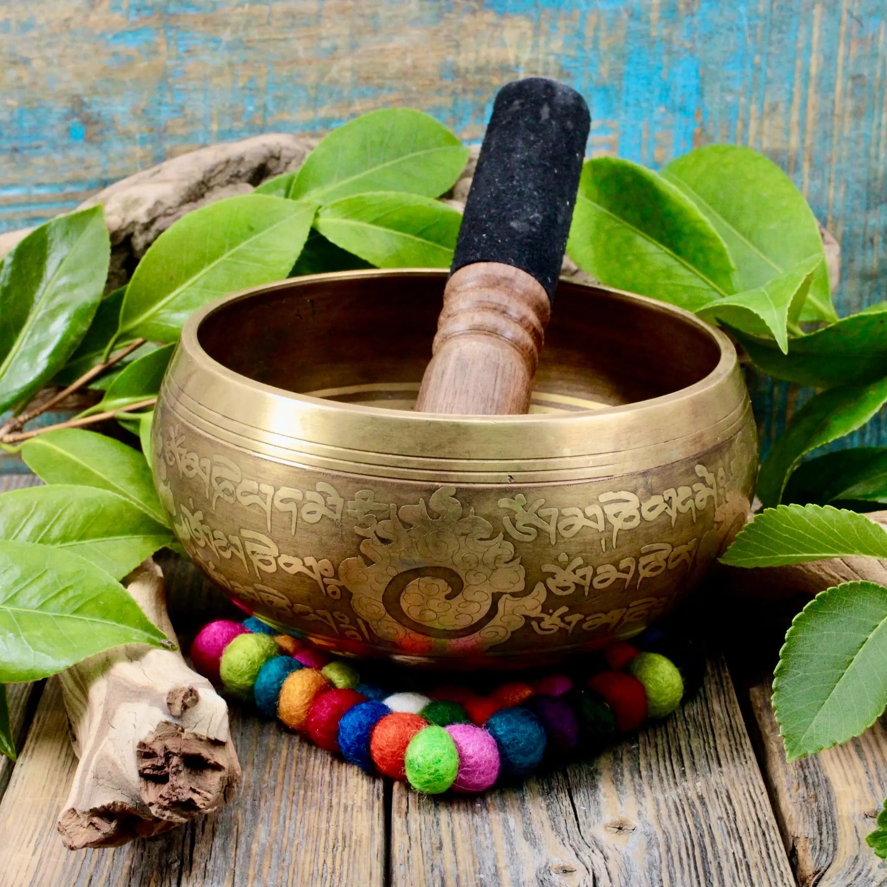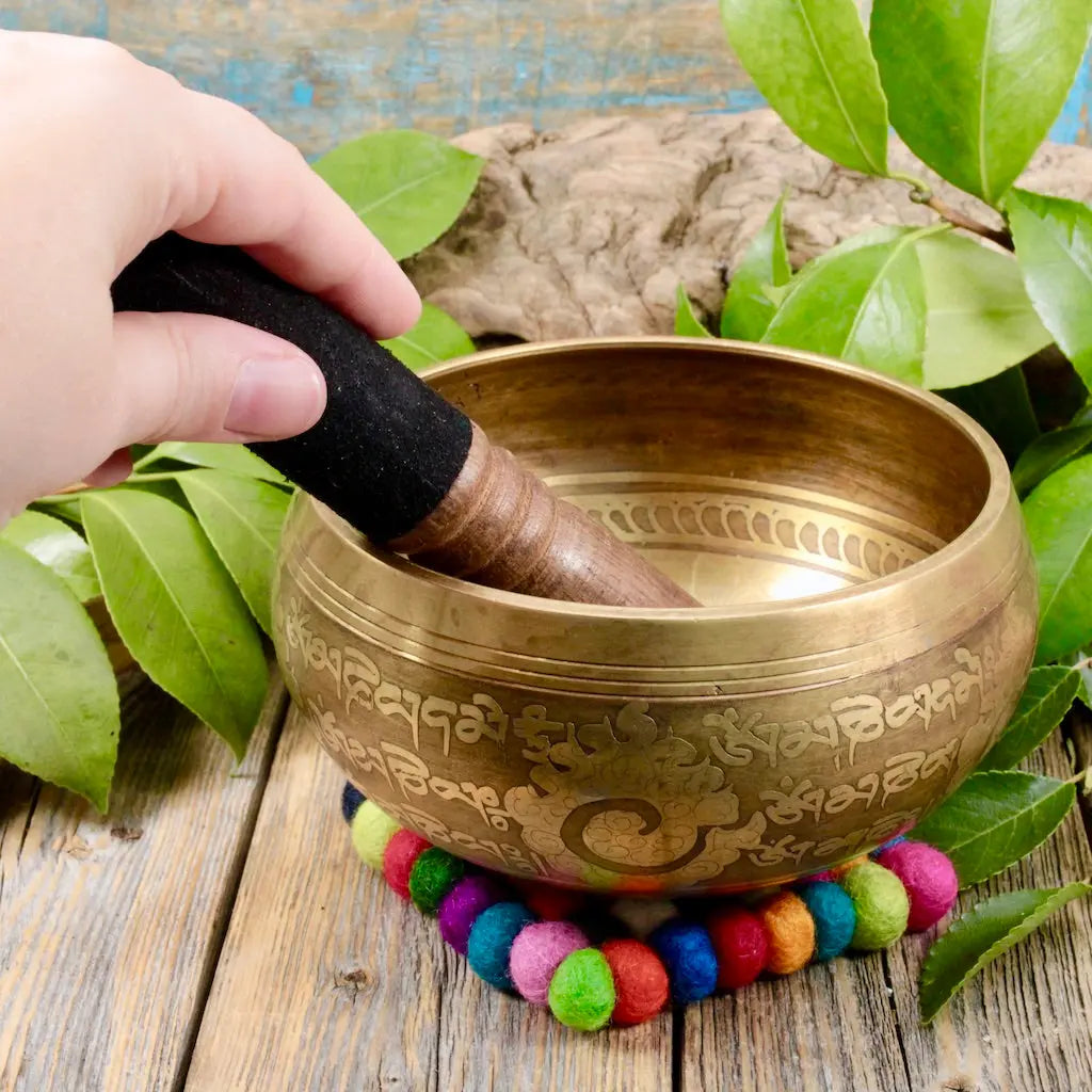 This gorgeous brass singing bowl comes with a sturdy wooden striker and an adorable multicolored pad to rest the bowl on. The etched details of the bowl are exquisite and the deep, calming tones push away negative energy and invite a new beginning to each day.
